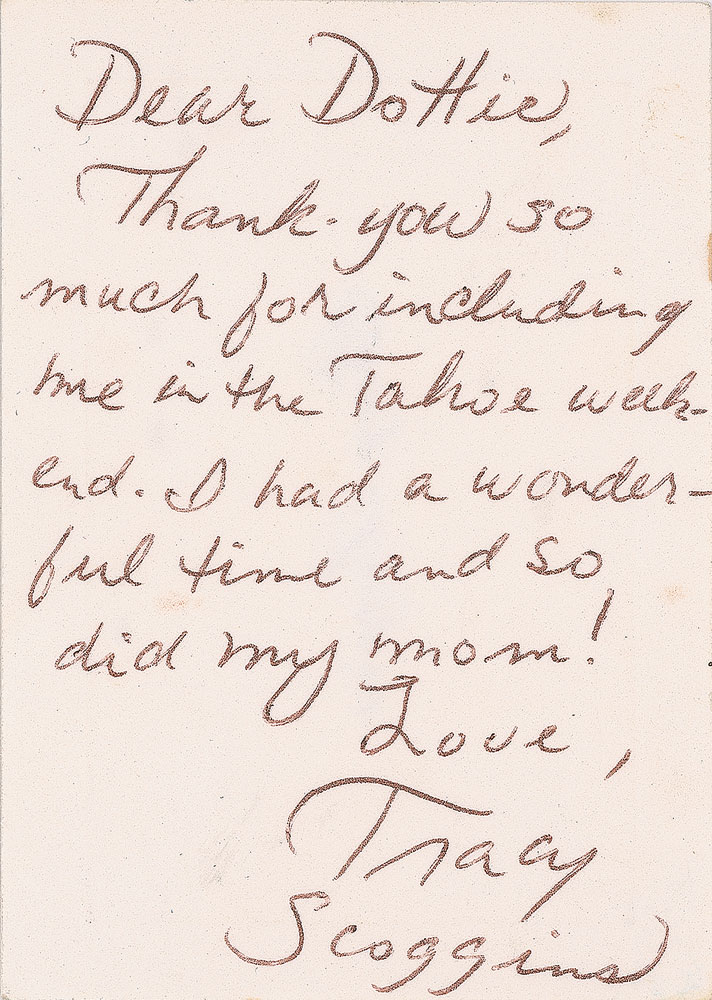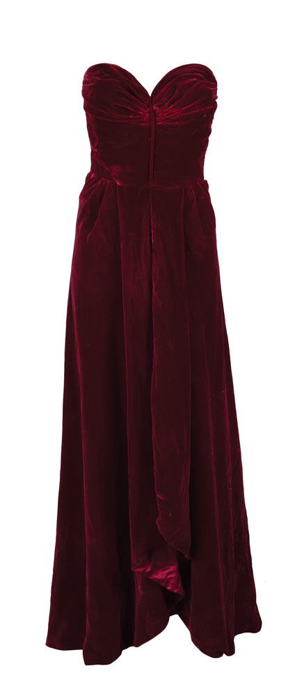 American actress (born 1953) known for her roles in the prime time soap opera Dynasty, its spin-off series The Colbys, television series Lois & Clark: The New Adventures of Superman, and in the final season of Babylon 5. Attractive maroon dress, screen-worn by Tracy Scoggins in her role as Monica Scott Colby in the ABC television soap opera The Colbys. This floor-length ball gown features a zip-up back, and the inside of the built-in bra bears a Nolan Miller tag, marked "T. Scoggins." Includes a personal calling card belong to Scoggins, 3 x 2.25, which bears a brief ANS on the reverse: "Dear Dottie, Thank you so much for including me in the Tahoe weekend. I had a wonderful time and so did my mom! Love, Tracy Scoggins." In fine condition. Accompanied by a glossy 8 x 10 photo of Scoggins wearing the gown.