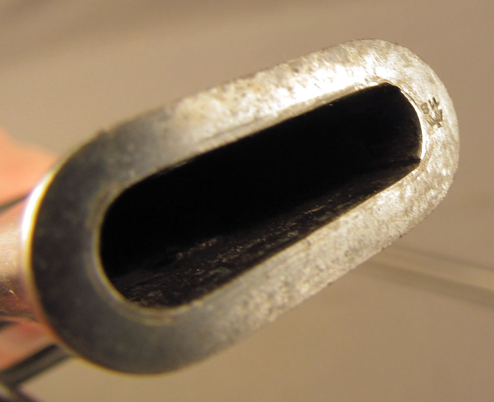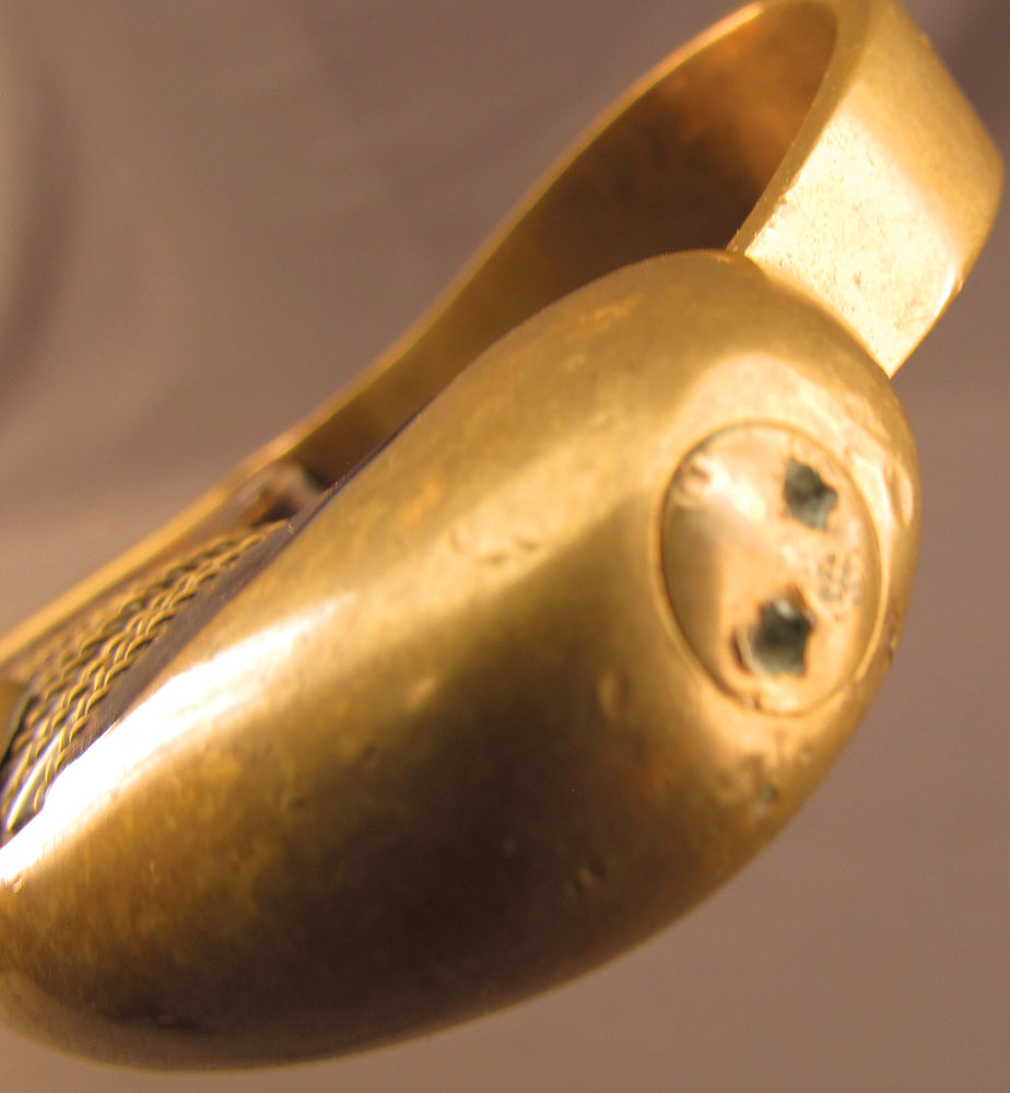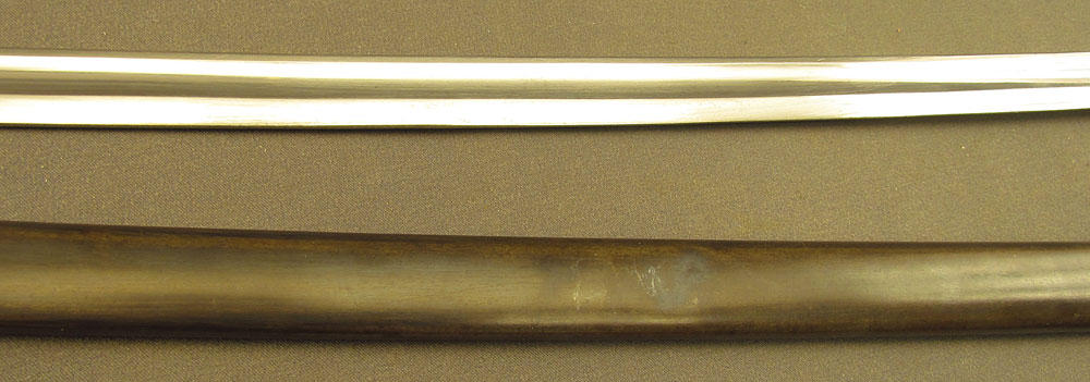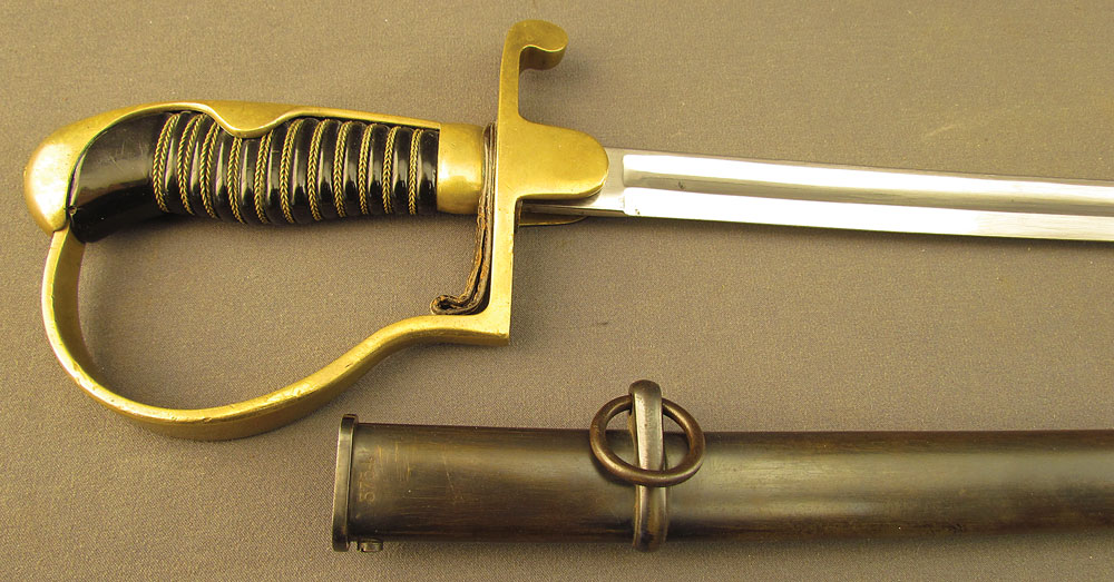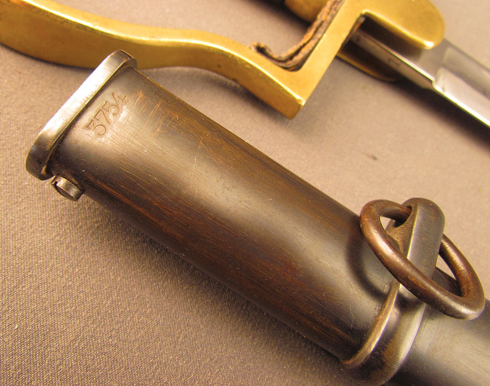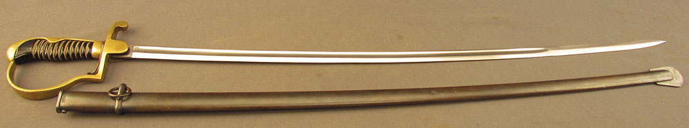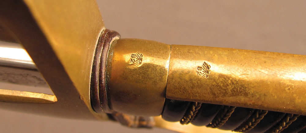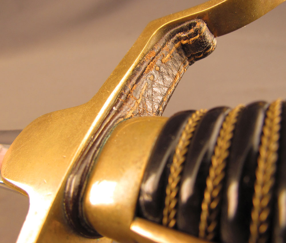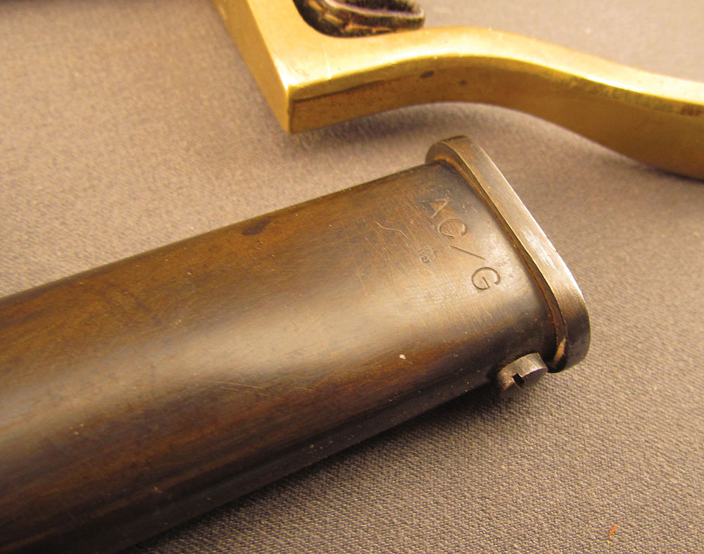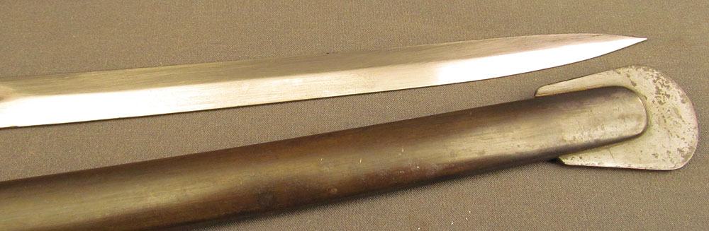 WWII-era German Army Ordnance Sword by ALCOSO, measuring 39 3/8″ overall with a 34″ slightly curved, single-edged blade with long single fullers. The blade has an excellent, nearly spotless original polish, but does exhibit a few very minor specks of dark freckling on the forte obverse. A deeply struck ALCOSO “Scales” trademark is present on the ricasso reverse, as is a small Waffenamt proof on the back edge just above the hilt. The hilt itself is of standard pattern with single quillon, unmarked tombstone langets, stirrup guard, and dove pommel. The brass has a mild, yellow-ochre patina throughout with some very minor impact marks near the capstan nut, and the numerous Waffenamt proofs and issue stamps are all crisp and clear. The leather ‘fingerschlauf’ (finger loop) is crazed and lightly flaked, but still intact and quite supple. The black composite grip is in excellent condition with a tight, original wire wrap. The matching numbered scabbard has a smooth, blue-brown patina with a few shallow dents along the body on either side. This is a great example of a Heer-issued sword and would make a splendid addition to any collection.
