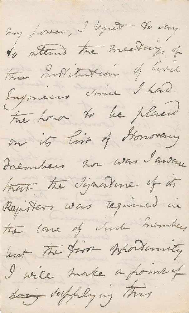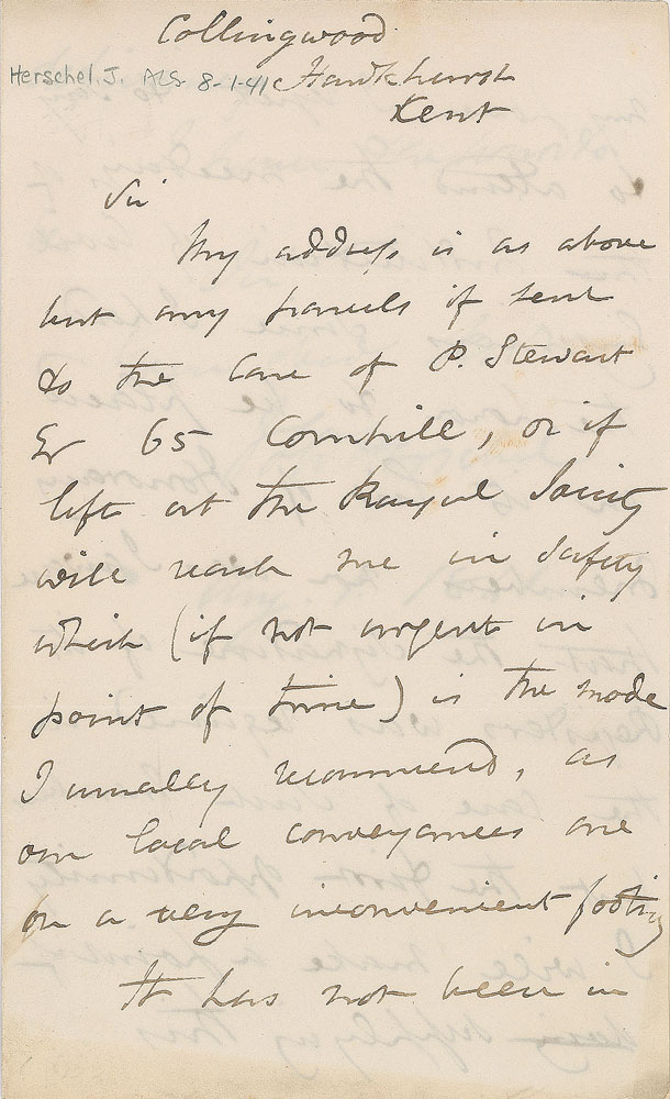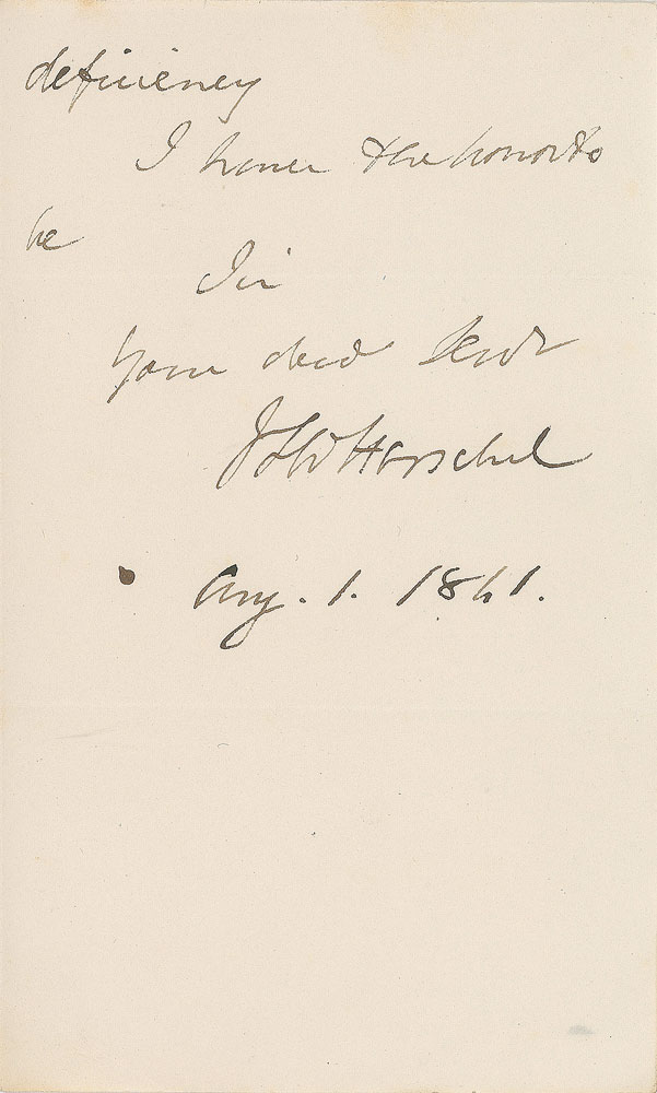 British mathematician, astronomer, and inventor (1792-1871) known for his discoveries related to the moons of Saturn and Uranus and for his pioneering work in early photographic processes, including coining the word 'photography' itself. ALS signed “J. F. W. Herschel,” three pages on two adjoining sheets, 4.5 x 7.25, August 1, 1841. Letter to a gentleman, in part: "My address is as above but any parcels if sent to the care of P. Stewart Esq., 65 Cornhill, or if left at the Royal Society will reach me in safety which (if not urgent in the point of time) is the mode I usually recommend, as our local conveyances are on a very inconvenient footing. It has not been in my power, I regret to say, to attend the meeting of the Institution of Civil Engineers since I had the honor to be placed on its list of Honorary Members nor was I aware that the signature of its Registers was required in the case of such members but the first opportunity I will make a point of supplying this deficiency." In fine condition, with creasing to the lower corners.