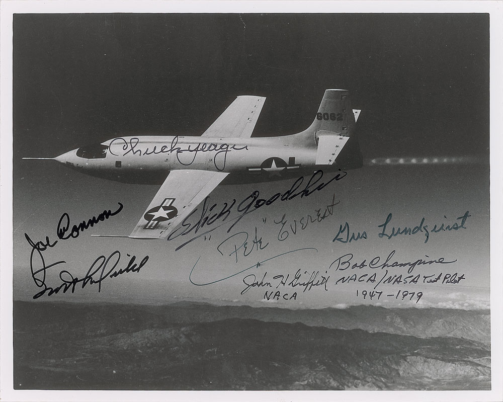 Excellent glossy 10 x 8 photo of a soaring Bell X1-6062 aircraft, signed in black felt tip by eight legendary test pilots: "Chuck Yeager," "Joe Cannon," "Scott Crossfield," "[Chalmers] Slick Goodlin," "[Frank Kendall] 'Pete' Everest," "John H. Griffith, NACA," "Gus Lundquist," and "Bob Champine, NACA/NASA Test Pilot, 1947-1979." In very fine condition.