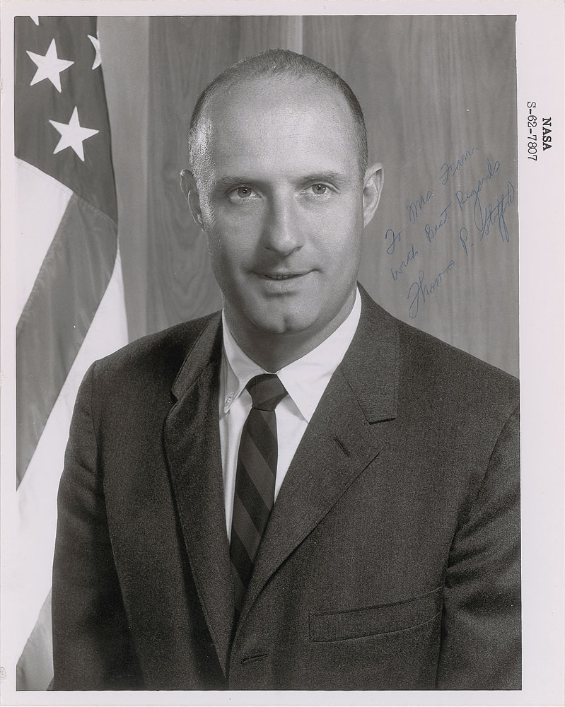 Official glossy 8 x 10 black-numbered NASA photo of Stafford wearing a suit and tie, signed and inscribed in black ballpoint, "To Ms. Fan, with Best Regards, Thomas P. Stafford.” Reverse bears NASA caption text. In fine condition, with light irregularity to the emulsion, visible at an angle.