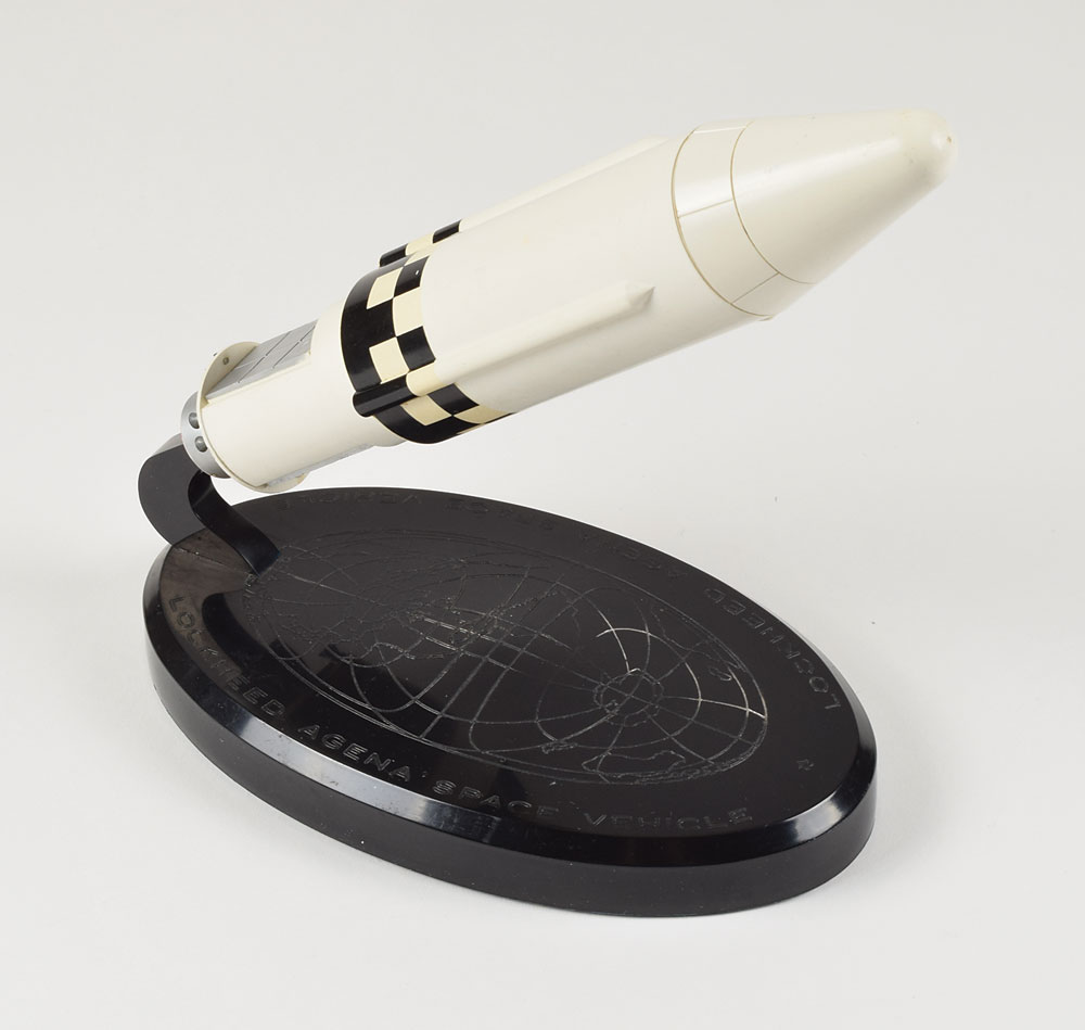 Vintage model of a Lockheed Agena Space Vehicle by Topping Models, standing 9″ tall, 11″ in length, and set on a 9.25 x 5.25 x 1 plastic base with engraved map and raised text. In fine condition, with wear to paint and labels.