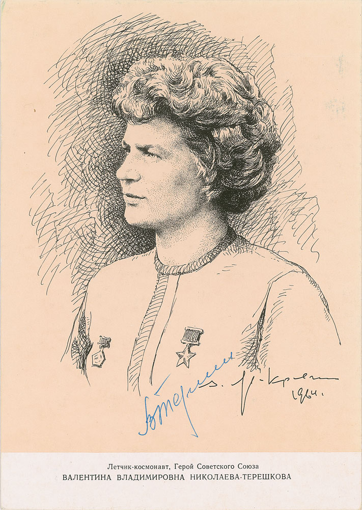 Russian print featuring an illustration of the first woman in space, 5.75 x 8.25, signed in blue ballpoint by Tereshkova. In fine condition.