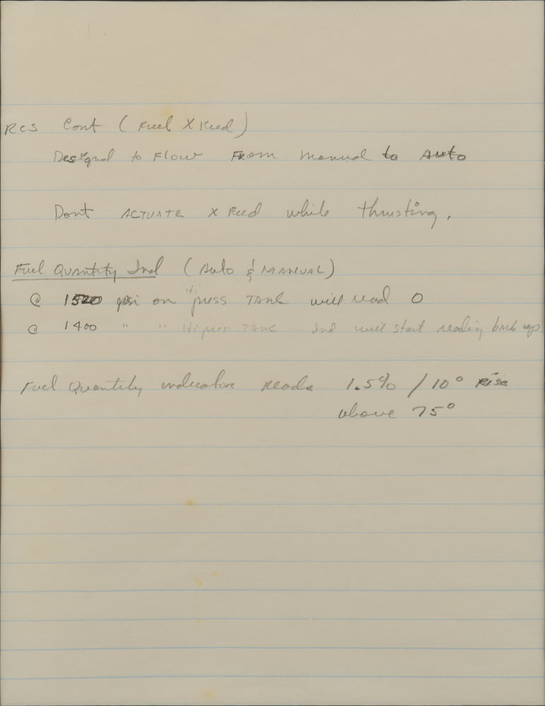 Desirable pairing of Gordon Cooper items: one page of Cooper's handwritten notes in pencil related to his spacecraft's Reaction Control System, taken in preparation for his historic MA-9 flight aboard the Faith 7 in 1963, 7.25 x 9.25, in part: "RCS Cont (Fuel x Feed), Designed to flow from manual to auto. Don't actuate x feed while thrusting," with further notes on fuel and PSI; and a color satin-finish 7.25 x 9.25 photo of Cooper in his silver Mercury space suit, signed in blue felt tip, "Gordon Cooper, Faith 7." Nicely double-matted and framed side-by-side to an overall size of 24 x 16.5. In fine condition. Accompanied by a photocopy of a letter of authenticity from Zarelli Space Authentication for the handwritten notes, which were once part of a four-page lot. On Mercury Atlas-9, launched on May 15, 1963, Cooper completed 22 Earth orbits before landing in the Pacific Ocean—the last American to complete a solo orbital mission.