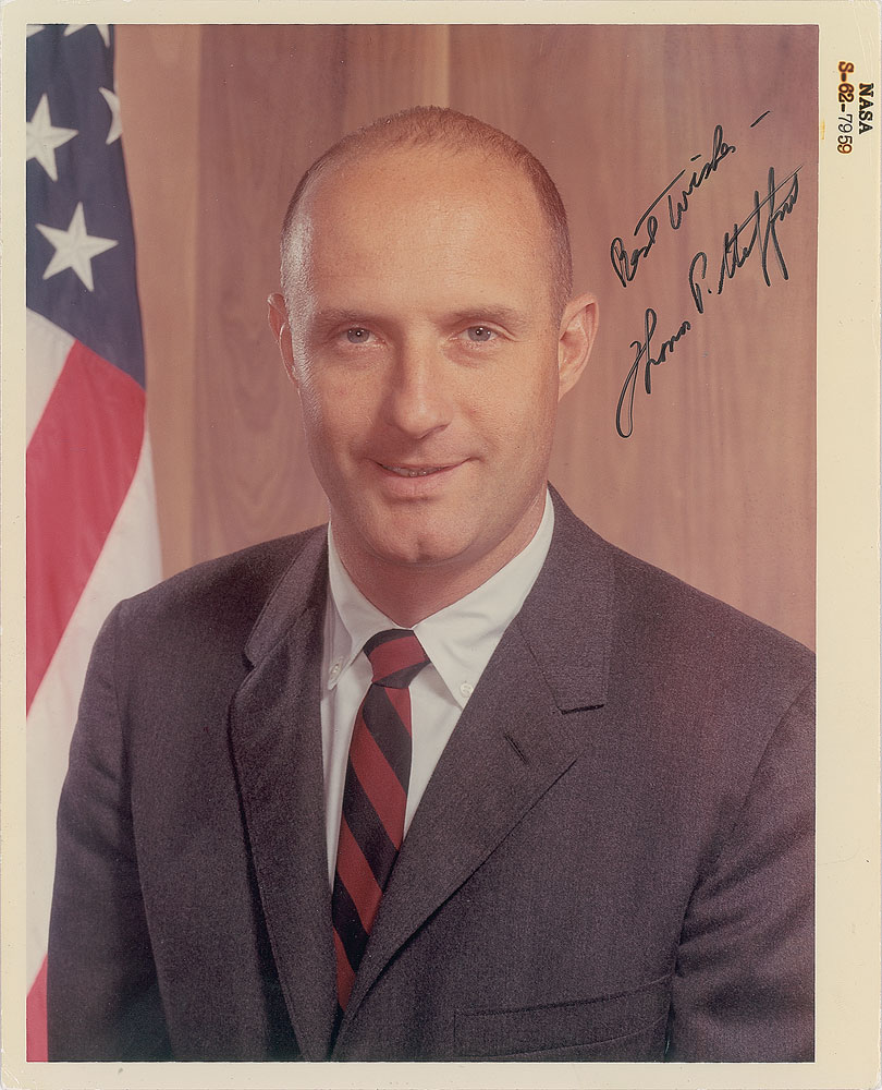 Official color glossy 8 x 10 red-numbered NASA photo of Stafford in a suit and tie, signed in black felt tip, "Best wishes—Thomas P. Stafford." Reverse bears purple NASA caption text and “A Kodak Paper” watermarks. In fine condition, with a ding to the lower left corner tip.