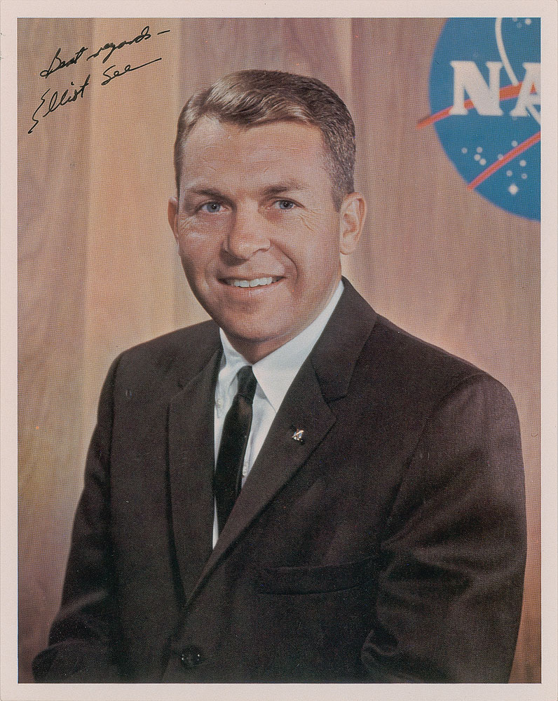 Official color 8 x 10 NASA lithograph of See posing in a suit and tie, signed in black felt tip, "Best regards—Elliot See." In fine condition, with four divots to the image, all on See's jacket.