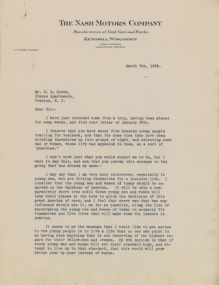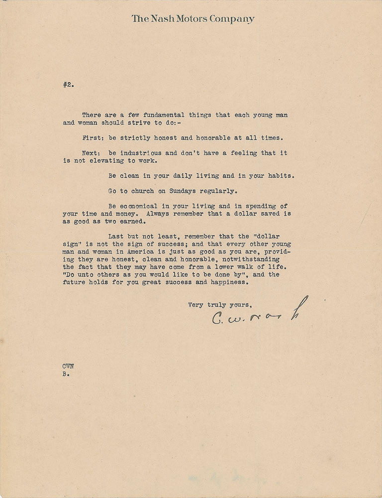 American automobile entrepreneur (1864-1948) who served as an executive in the automotive industry and played a major role in building up General Motors. Wonderful TLS signed “C. W. Nash,” two pages, 8.5 x 11, The Nash Motors Company letterhead, March 9, 1925. Letter to S. D. Green, in part: "I may say that I am very much interested, especially in young men, who are fitting themselves for a business life. I consider that the young men and women of today should be regarded as the backbone of America. It will be only a comparatively short time until these young men and women will take their places at the helm to guide the destinies of this great America of ours; and I feel that every man that has any influence should use it, as far as possible, along the line of encouraging the young men and women of today to properly fit themselves and live lives that will make them the leaders in America…There are a few fundamental things that each young man and woman should strive to do:—First: be strictly honest and honorable at all times. Next: be industrious and don't have a feeling that it is not elevating to work. Be clean in your daily living and in your habits. Go to church on Sundays regularly. Be economical in your living and in spending of your time and money. Always remember that a dollar saved is as good as two earned. Last but not least, remember that the 'dollar sign' is not the sign of success; and that every other young man and woman in America is just as good as you are, providing they are honest, clean and honorable." In fine condition, with a rusty paperclip impression to the top edge.