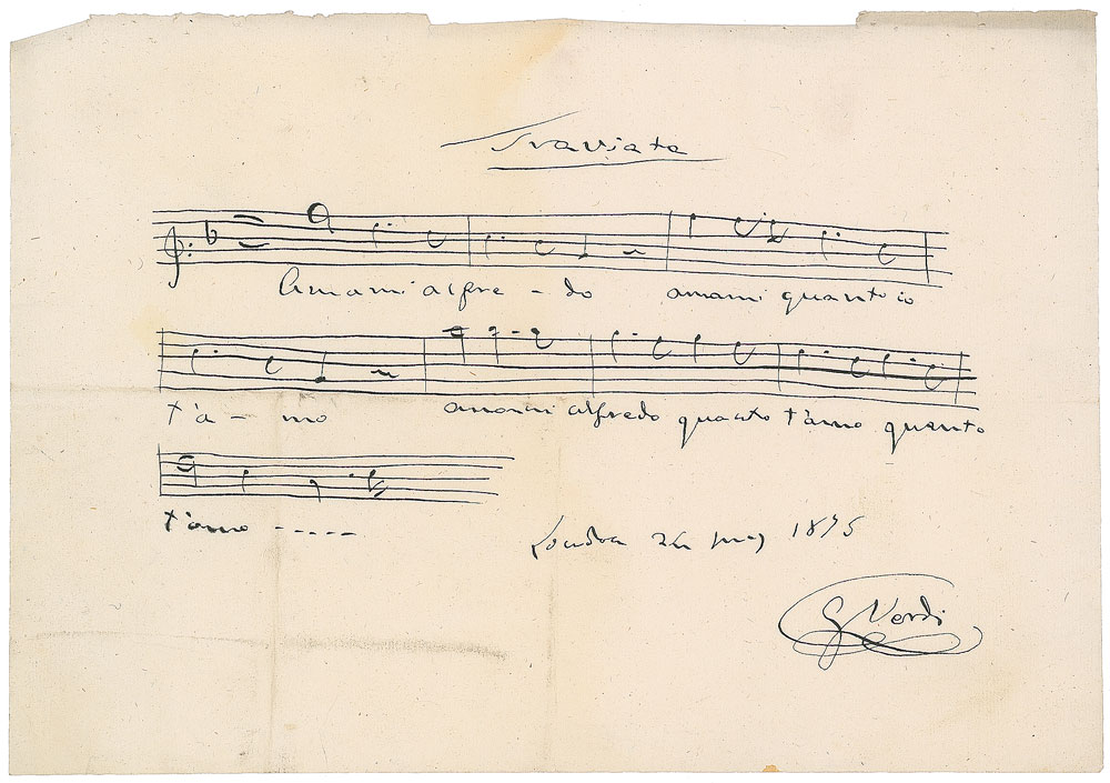 Beautifully penned AMQS on an off-white 11.25 x 7.75 sheet, signed at the conclusion in black ink, "G. Verdi," and dated at London, May 24, 1875. Verdi pens eight bars of music and lyrics from his three-act opera 'La traviata.' In fine condition, with some very light stains and tiny binding holes along the top edge. Based on La Dame aux Camelias, a play adapted from the novel by Alexandre Dumas, fils, 'La traviata' premiered at the Teatro La Fenice in Venice on March 6, 1853. At the time of signing, Verdi was busy performing his new requiem 'Liber scriptus,' which was first heard in its new and final version on May 15, 1875, at London's Royal Albert Hall.
