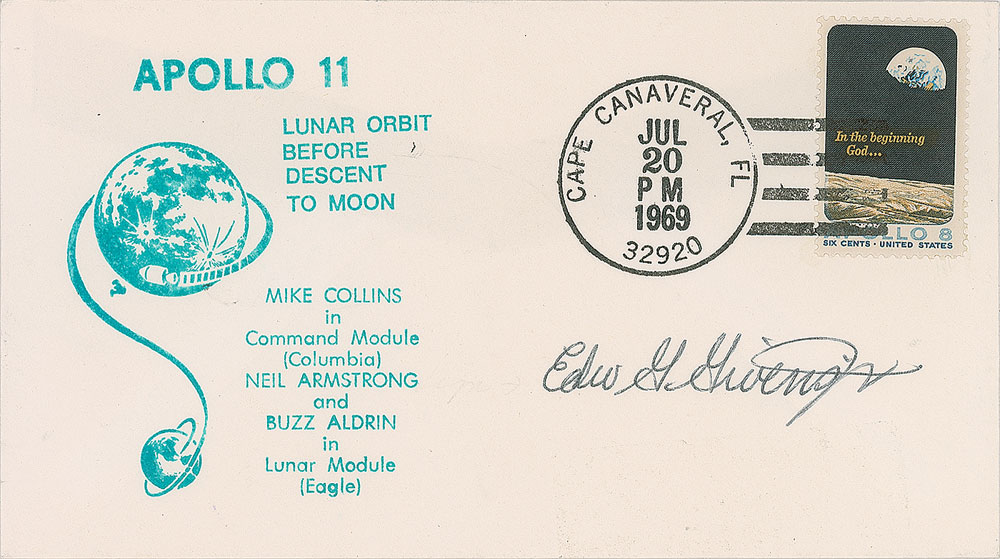 United States Air Force officer, test pilot, and NASA astronaut (1930-1967) who was selected as a member of the fifth astronaut group by NASA in 1966; he was killed in an automobile accident before being assigned to a prime or backup spaceflight crew. Commemorative cover with a color cachet honoring the Apollo 11 mission, postmarked July 20, 1969, the moon-landing date of Apollo 11, signed in black ballpoint, "Edw. G. Givens, Jr." In very fine condition.
