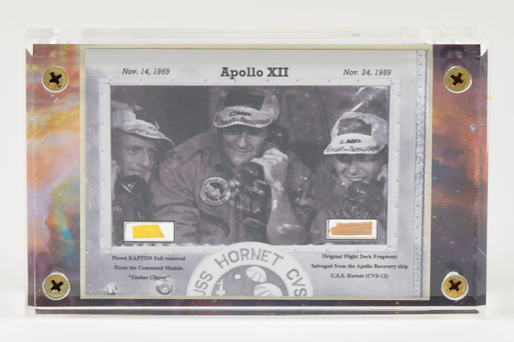 Flown .5 x .25 swatch of Kapton foil recovered from the Apollo 12 command module Yankee Clipper. Presented in a plastic screw-down display, 5.75 x 3.5 x 1, with information text, an image of the Apollo 12 crew in quarantine, and an original .5 x .25 flight deck fragment salvaged from the Apollo recovery ship the USS Hornet. In fine condition.
