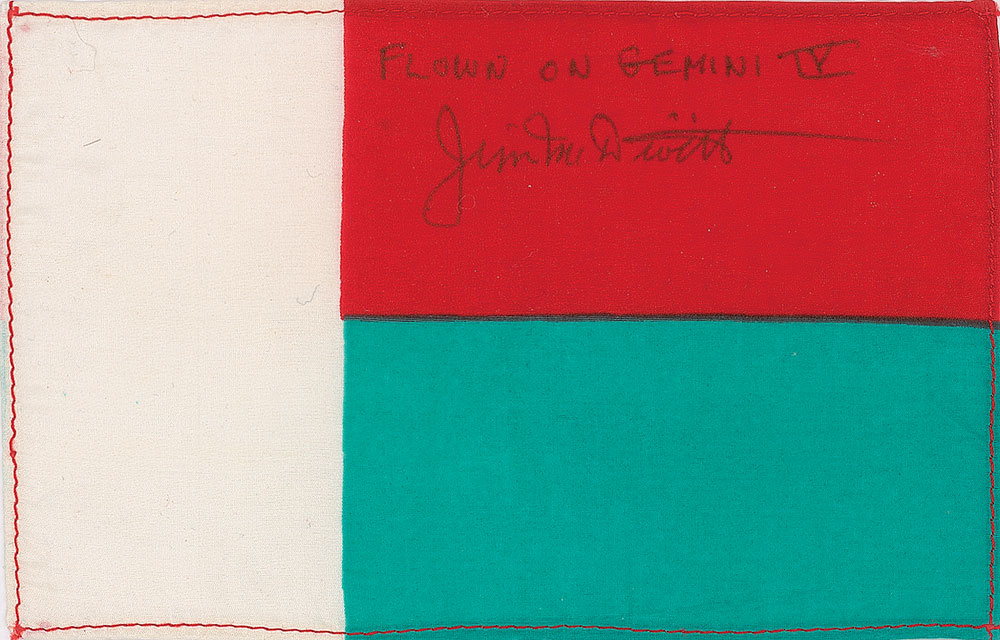 Flown fabric Madagascar flag carried aboard the Gemini 4 spacecraft, 6.25 x 4, signed and flight-certified in black ink, "Flown on Gemini IV, Jim McDivitt." In fine condition. Accompanied by a certificate of authenticity from Astronaut Central, certifying the flag as being from McDivitt's personal collection.