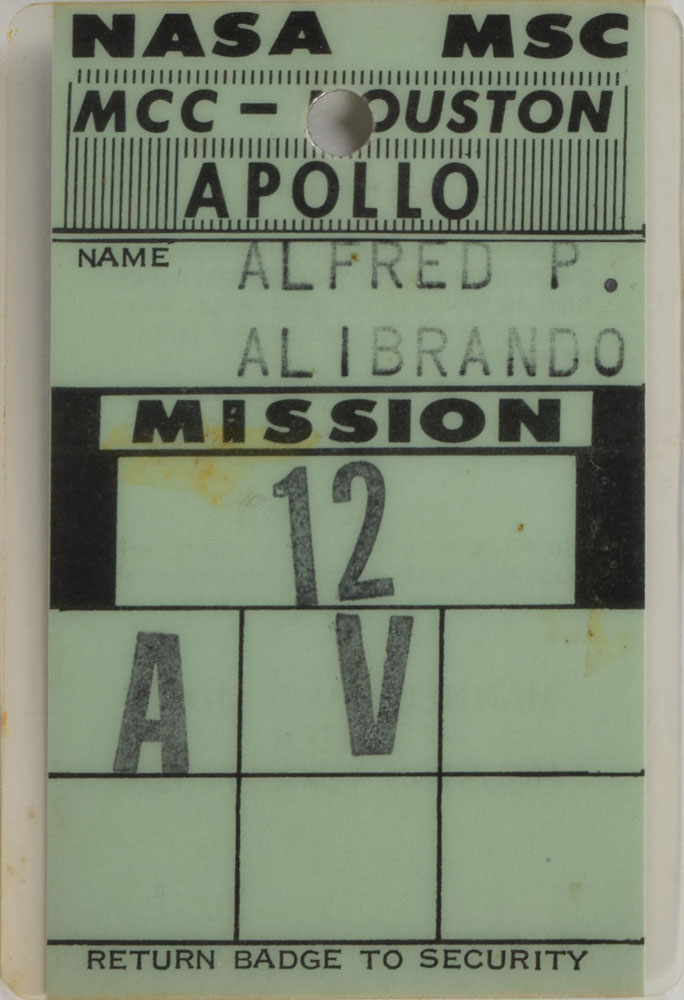 Green laminated NASA Mission Control Center access badge, 2.5 x 3.75, issued to "Alfred P. Alibrando" for the Apollo 12 mission and stamped "AV." In fine condition. Alfred P. 'Al' Alibrando was a NASA public information/public affairs officer from 1960 to 1975.