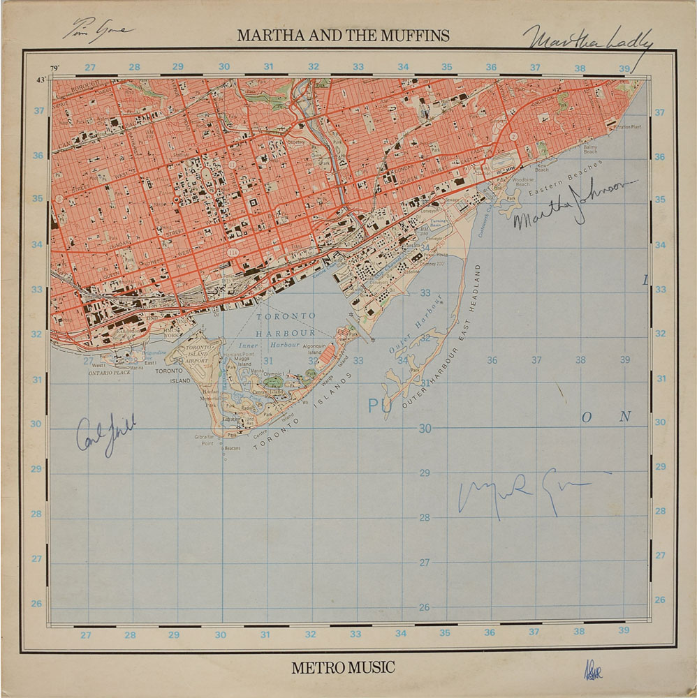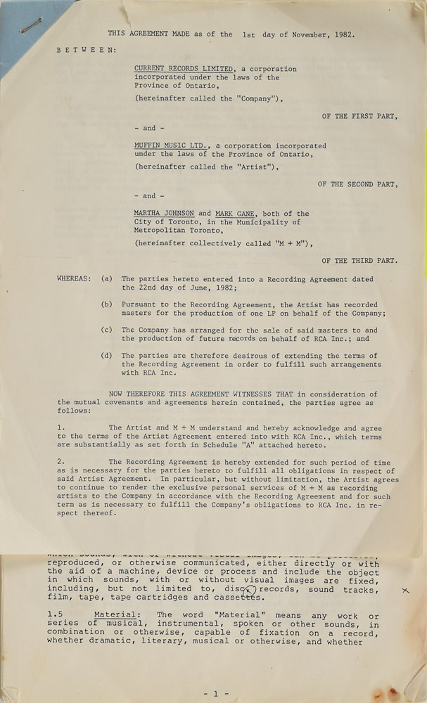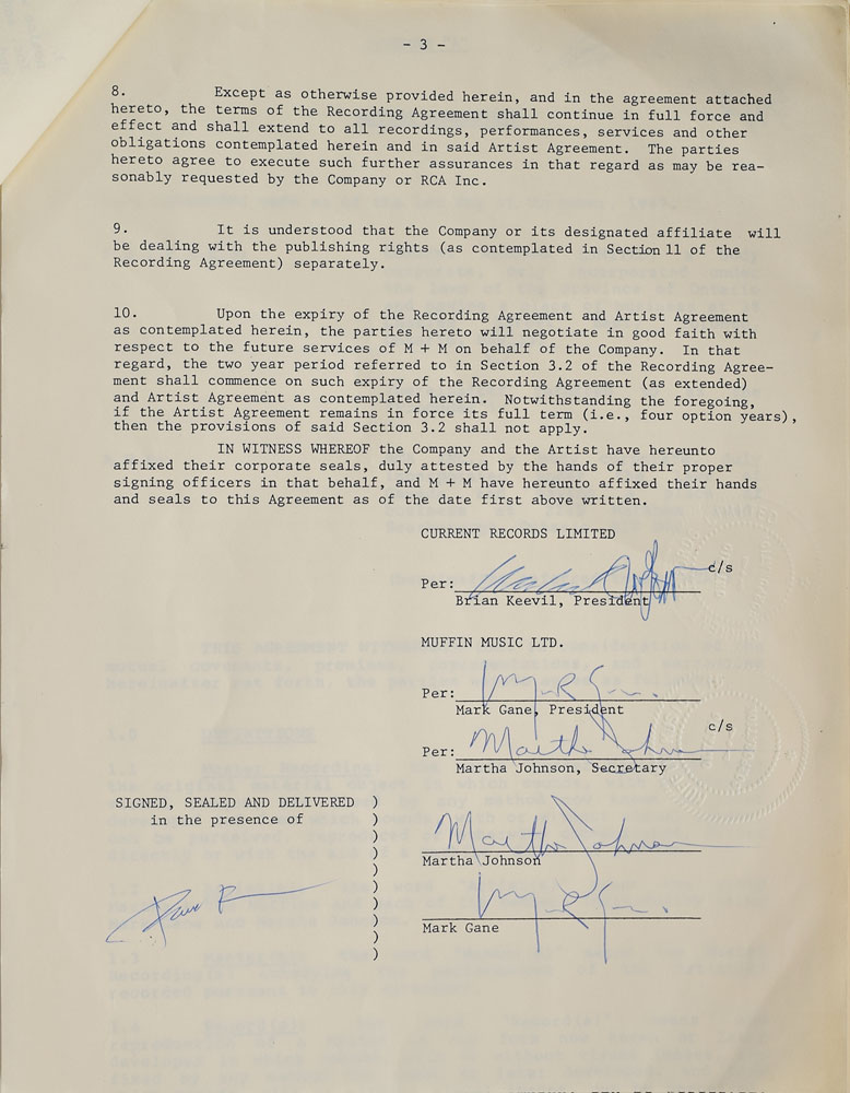 Two items: a Metro Music album signed on the front cover in ballpoint and ink by Martha Johnson, Martha Ladly, Mark Gane, Carl Finkle, Tim Gane, and Andy Haas; and a DS, three pages, 8.5 x 14, November 1, 1982, an agreement between Current Records Limited, Muffin Music Ltd., and Martha Johnson and Mark Gane, which relates to an artist agreement with RCA, Inc., signed twice at the conclusion in ballpoint by Johnson and Gane, who add their initials to the upper right corner of the attached artist agreement. The record is included. In overall fine condition.