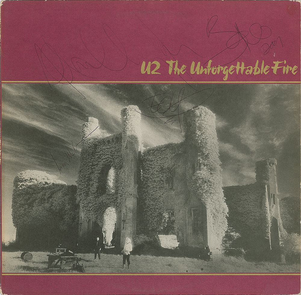 The Unforgettable Fire album signed on the front cover in black ballpoint, "Adam Clayton," "Bono, 2001," "Edge," and "Larry Mullen." In fine condition, with scotch tape along the edges of the back cover, and moderate contrast to the signatures. The record is not included. Accompanied by a full letter of authenticity from JSA.
