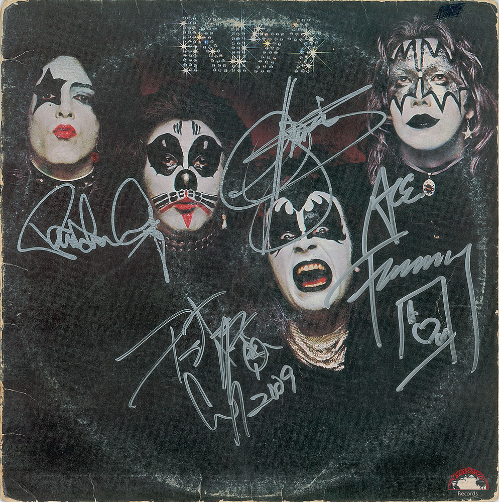 Self-titled debut album signed on the front cover in silver ink by Paul Stanley, Gene Simmons, Peter Criss, who adds "2009," and Ace Frehley, who adds a playing card. In very good condition, with scuffing, creasing, and scotch tape along the edges of the back cover. The record is not included.