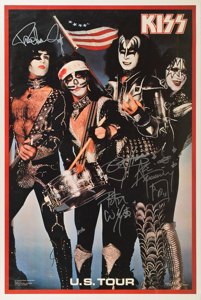 Color 23 x 34.25 poster for KISS's US Destroyer Tour of the summer of 1976, also known as The Spirit of '76 Tour, signed in silver ink by Paul Stanley, Peter Criss (adding "2016"), Gene Simmons, and Ace Frehley, who adds a playing card. Rolled and in fine condition.