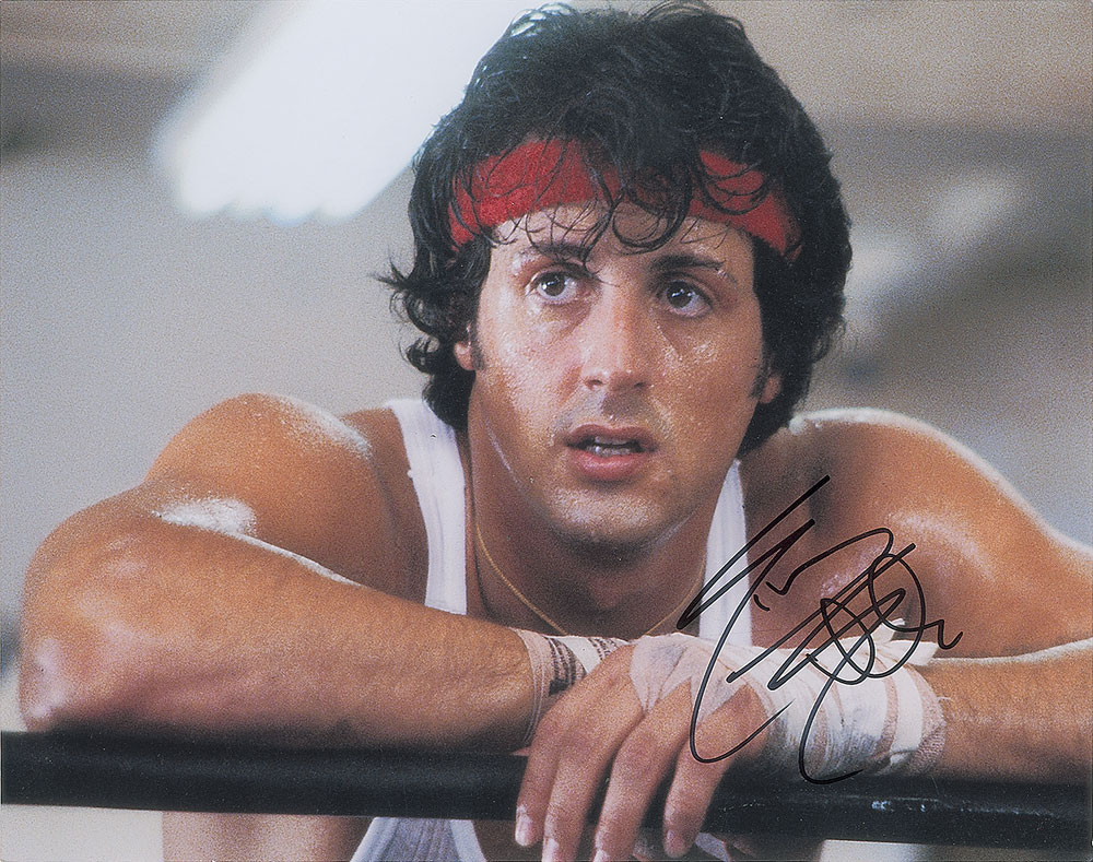 Color satin-finish 14 x 11 photo of Stallone as Philadelphia boxing legend Rocky Balboa, signed in black felt tip. In fine condition, with a crease to the upper left corner.