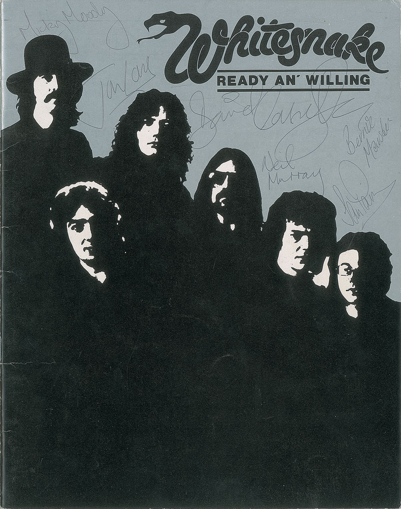Fantastic UK program for Whitesnake's 1980 Ready an' Willing Tour, twenty pages, 9.5 x 12, signed neatly on the front cover in black ballpoint by David Coverdale, Micky Moody, Bernie Marsden, Jon Lord, Neil Murray, and Ian Paice. In fine condition. Accompanied by a letter of provenance from the original recipient, in part: "This concert programme, fully signed by the 1980 line up of Whitesnake, was given to me back in the day by the band's guitarist, Bernie Marsden. I come from the same small market town as Bernie and have known him most of my life."