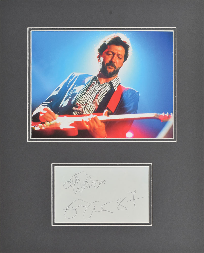 Ballpoint signature, “Best wishes, Eric Clapton, 87,” on an off-white 6.5 x 3.75 sheet. Double-matted with an image of Clapton playing the guitar to an overall size of 14.25 x 17.5. In fine condition.