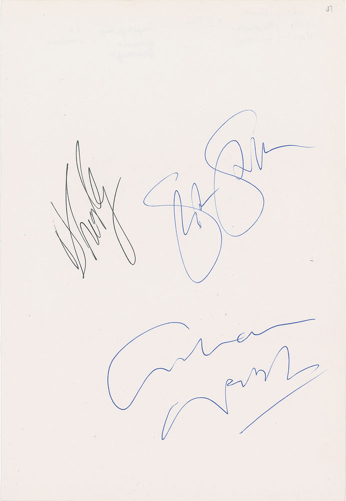 Off-white 8 x 11.5 sheet signed in black ink, "David Crosby," and in blue ballpoint, "Stephen Stills" and "Graham Nash." In fine condition.