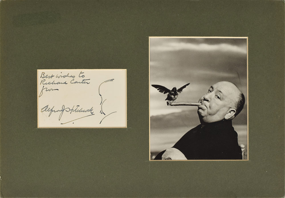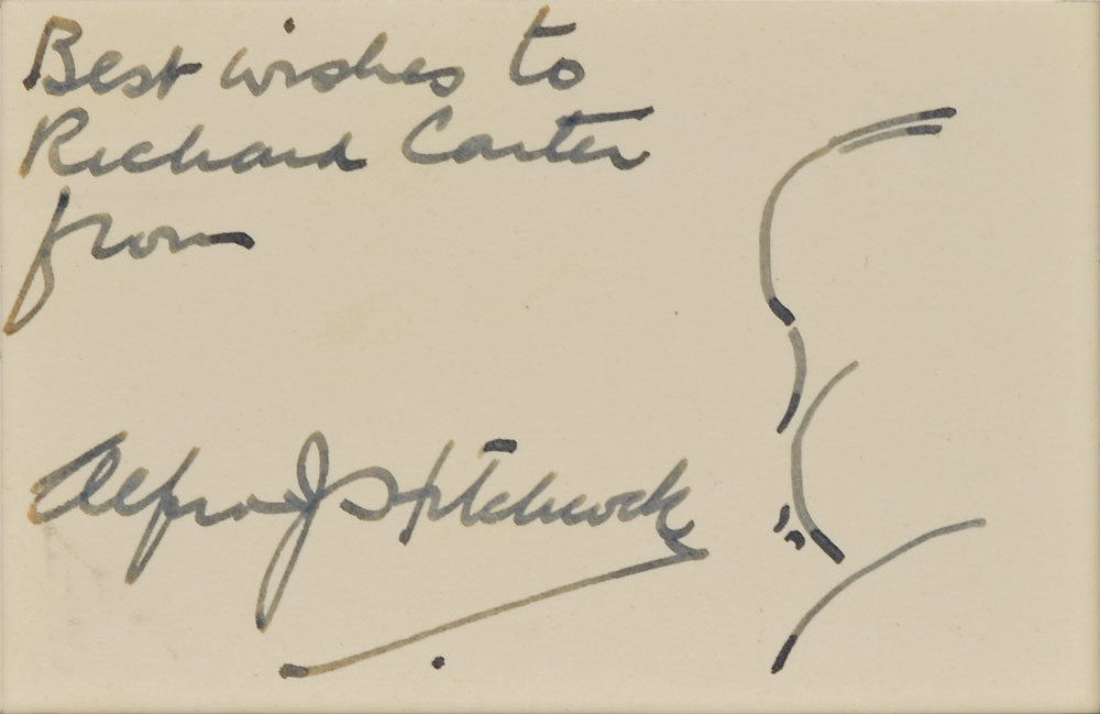 Original ink self-portrait sketch of his immediately recognizable profile on an off-white 3.5 x 2.25 card, signed and inscribed in black ink, "Best wishes to Richard Carter from Alfred J. Hitchcock." In fine condition.