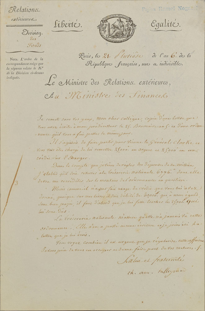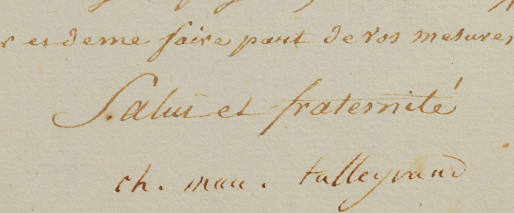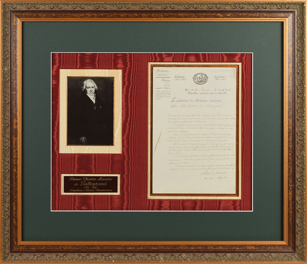 Highly skilled and influential diplomat (1754-1838) who served the French government from the reign of Louis XVI through that of Louis-Philippe. Manuscript DS, in French, signed “Ch. Mau. Talleyrand,” one page, 7.75 x 11.5, February 9, 1798. Untranslated Ministry of Finance document, neatly signed at the conclusion in Talleyrand's diminutive hand. Impressively mounted, cloth-matted, and framed with a plaque and portrait to an overall size of 28 x 24. Professionally cleaned and mounted, and in fine condition.