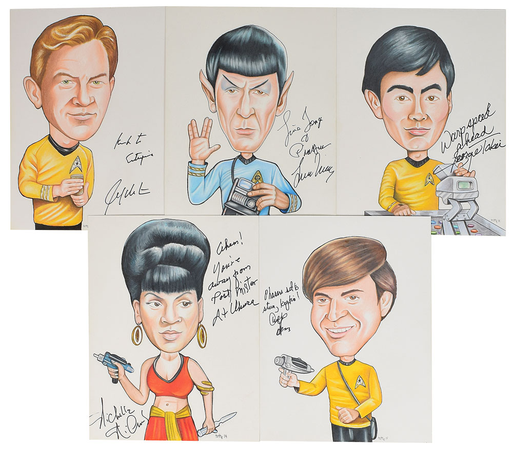 Incredible set of five colorful caricature sketches of famous Star Trek characters by artist Todd Tuttle, each accomplished in graphite, colored pencil, and felt tip on white 11 x 14 acid-free Bristol board, with each subject—Captain James T. Kirk, Commander Spock, Lieutenant Hikaru Sulu, Lieutenant Nyota Uhura, and Ensign Pavel Chekov—signed in black felt tip by their respective actor or actress: “Kirk to Enterprise, William Shatner,” “Live Long & Prosper, Leonard Nimoy,” “Warp speed ahead, George Takei,” “Ahem! You’re away from post, Mister. Lt. Uhura, Nichelle Nichols,” and “Phasers set to stun, Keptin! Walter Koenig.” Each caricature is signed and dated by the artist. In overall very fine condition. Tuttle is a Lambda Literary Award finalist author and artist who lives in Seattle, Washington. He began his art career at the age of 14 drawing editorial cartoons for a Florida newspaper and his illustrations have appeared in numerous national publications. Tuttle’s original artwork and prints are owned by many celebrities including Al Pacino, Leonardo DiCaprio, Reba McEntire, Betty White, Stan Lee, Johnny Rzeznik, and Billy Bob Thornton. This Star Trek caricature collection, which Tuttle started in 2009, took over seven years to acquire the signatures and quotes from each cast member.