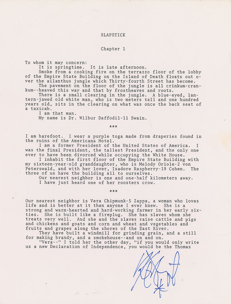 Souvenir typescript, one page, 8.5 x 11, signed at the conclusion in blue felt tip by Vonnegut. The opening to his novel Slapstick, beginning: "To whom it may concern: It is springtime. It is late afternoon. Smoke from a cooking fire on the terrazzo floor of the lobby of the Empire State Building on the Island of Death floats out over the ailanthus jungle which Thirty-fourth Street has become. The pavement on the floor of the jungle is all crinkum-crankum—heaved this way and that by frostheaves and roots. There is a small clearing in the jungle. A blue-eyed, lantern-jawed old white man, who is two meters tall and one hundred years old, sits in the clearing on what was once the back seat of a taxicab. I am that man. My name is Dr. Wilbur Daffodil-11 Swain." In fine condition.