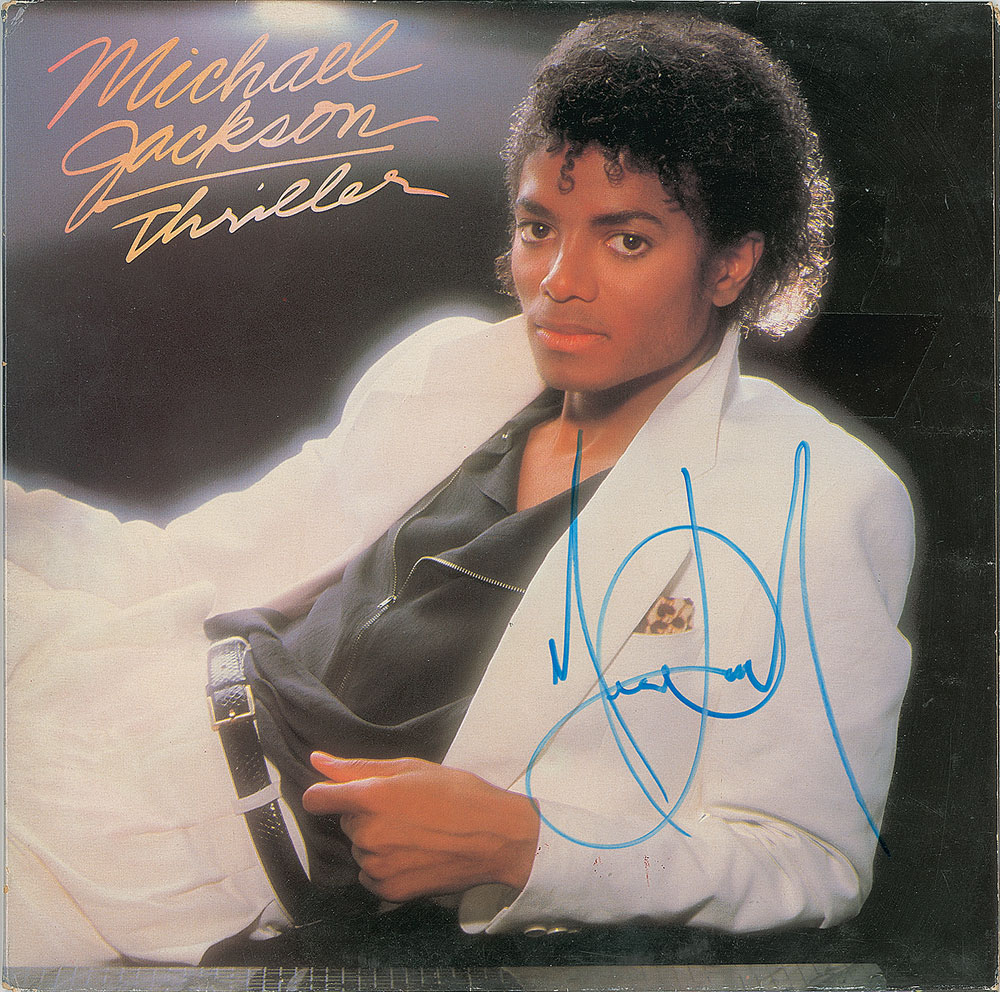 Thriller album signed on the front cover in blue felt tip by Michael Jackson. In fine condition, with light edge creasing and surface impressions. The record is included. Released in 1982, Thriller is widely considered one of the greatest and most influential pop albums of all time.