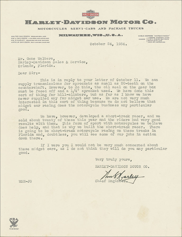 Racer and engineer (1880-1943) who co-founded the famed motorcycle manufacturer Harley-Davidson. TLS signed “Wm. S. Harley,” one page, 8.25 x 10.75, Harley-Davidson Motor Co. letterhead, October 24, 1934. Letter to Gene Walters, in part: "We have done this sort of thing for hill-climbers, but as far as I know we have never supplied any for midget car use. We are not very much interested in this sort of thing because we do not believe that midget car racing does the motorcycle business any particular good. We have, however, developed a short-track racer, and we sold about twenty of these this year and the riders had very good results with them. This form of sport with motorcycles we believe does help, and that is why we built the short-track racer. There is going to be short track motorcycle racing on these tracks in Florida and, doubtless, you will see some of our jobs in action down there.” In fine condition, with a light stain near the bottom.