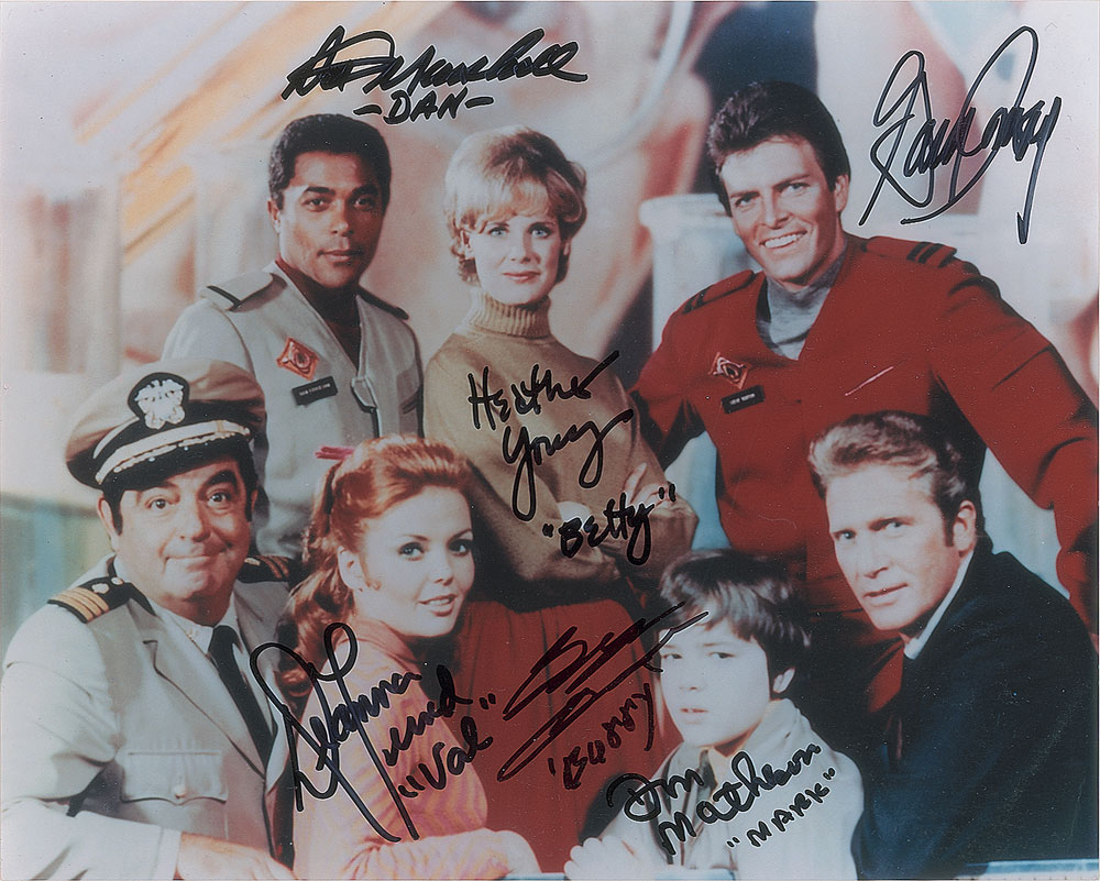 Color glossy 10 x 8 photo of the cast of Land of the Giants, signed in black felt tip by Gary Conway, Don Marshall, Don Matheson, Heather Young, Stefan Arngrim, and Deanna Lund, with all but Conway adding their character names. In fine condition.