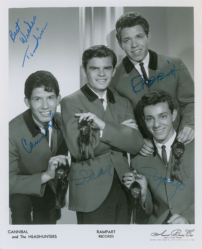Glossy 8 x 10 Rampart Records publicity photo of Cannibal and the Headhunters posing with shrunken voodoo heads, inscribed in blue felt tip, "Best wishes to Jim,” and signed by Frankie “Cannibal” Garcia, Robert “Rabbit” Jaramillo, Joe “Yo Yo” Jaramillo, and Richard “Scar” Lopez. In fine condition, with a light diagonal crease.