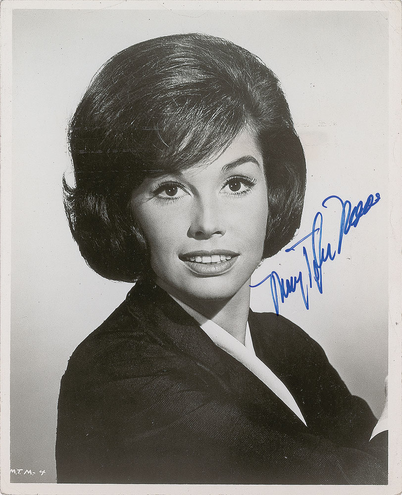 Attractive glossy 8 x 10 photo of Moore from around the days of the Dick Van Dyke Show, signed in blue felt tip. In fine condition, with scattered light creasing and surface impressions.