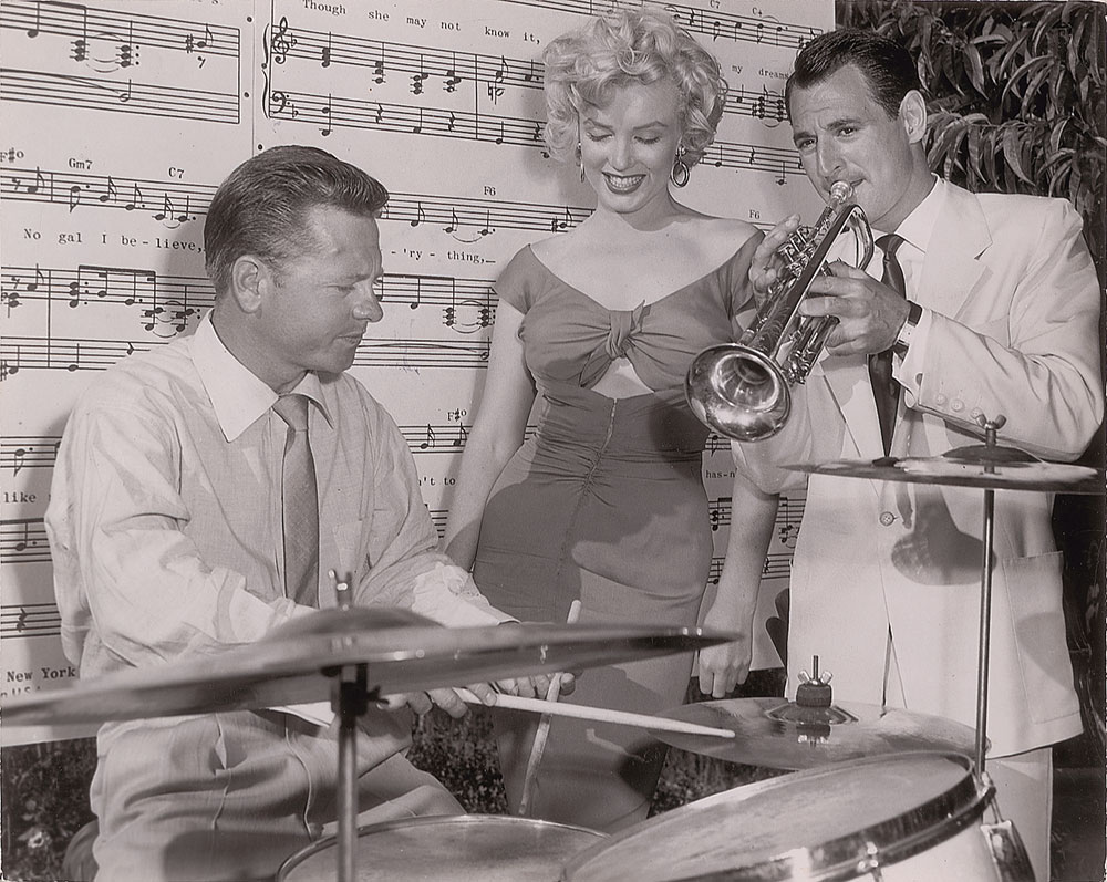 Original vintage glossy 9.5 x 7.5 silver gelatin photo of Marilyn Monroe with Mickey Rooney on drums and Ray Anthony on trumpet during a 1952 party. Reverse bears a Pictorial Parade credit stamp. In fine condition, with trimmed edges.