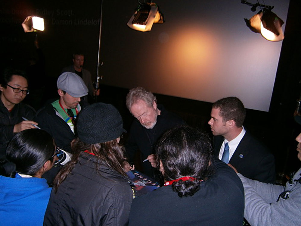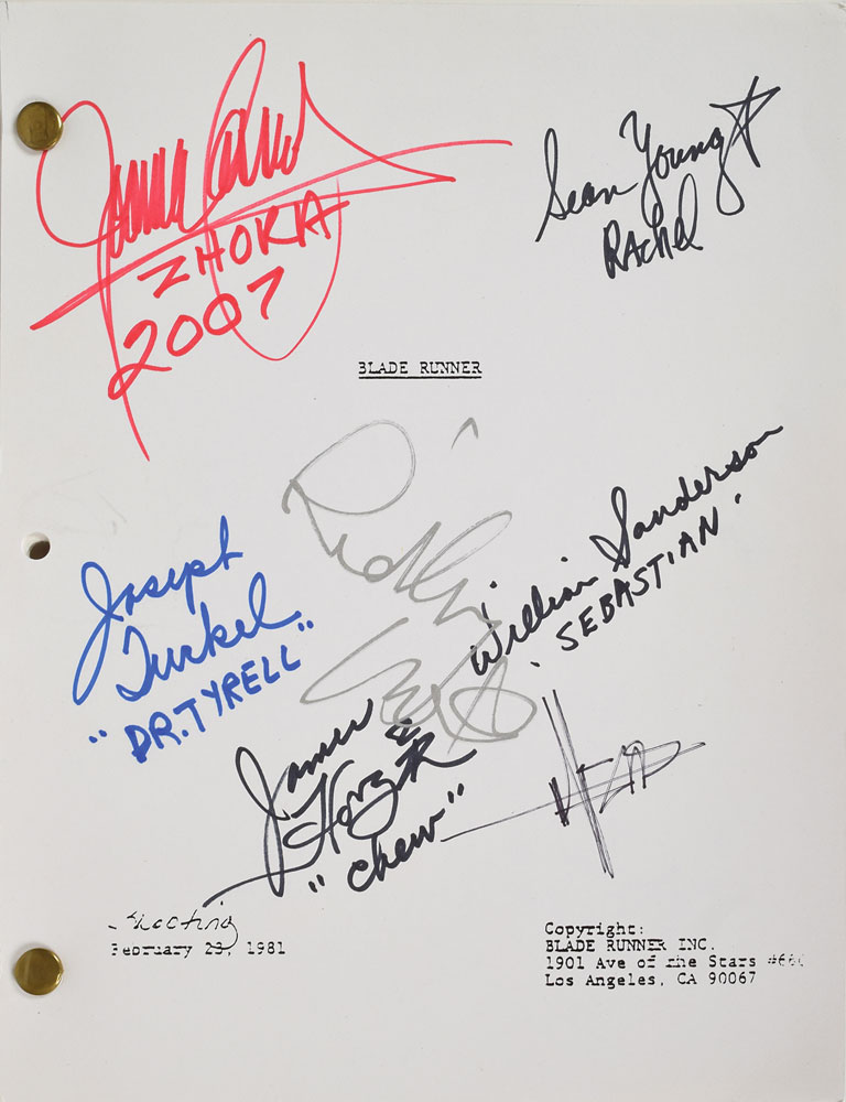Brad-bound souvenir shooting script for the 1982 neo-noir science fiction film Blade Runner, 133 pages, 8.5 x 11, signed on the title sheet in various ink types by Ridley Scott, Sean Young, Joanna Cassidy, William Sanderson, James Hong, Joe Turkel, and Syd Mead (concept designer), with several adding their character names. In fine condition. Consignor notes that the signatures were acquired in person between 2007 and 2012.