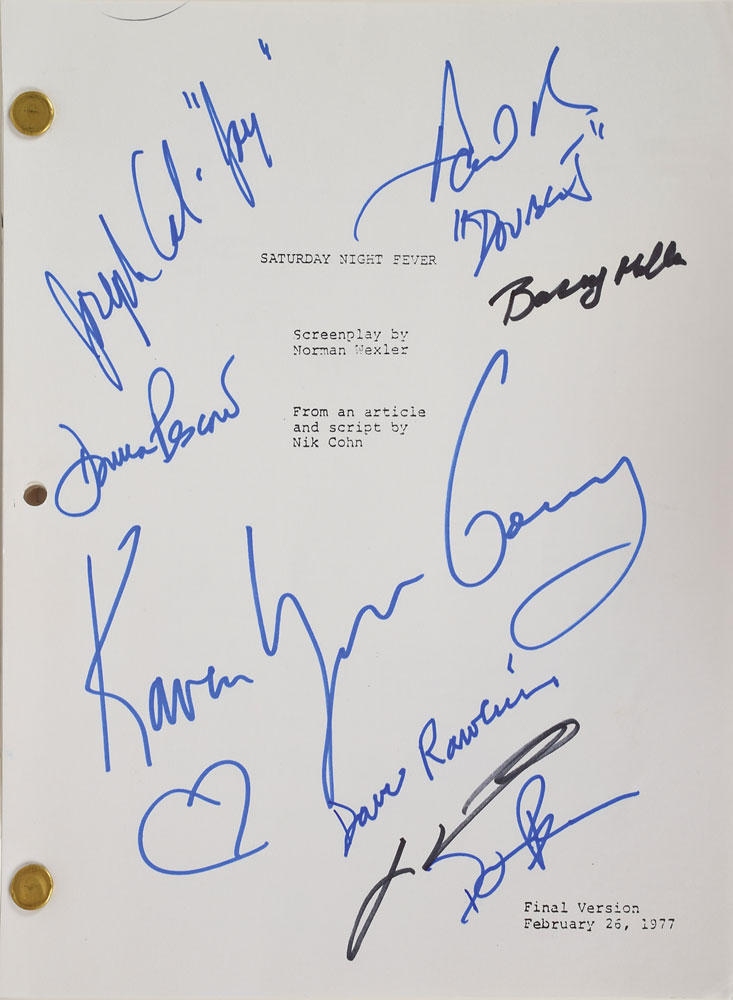 Brad-bound souvenir script for the 1977 musical drama Saturday Night Fever, 116 pages, 8.5 x 11, signed on the title sheet in blue or black felt tip by seven cast or crew members, including: John Travolta, Karen Gorney, Barry Miller, Joseph Cali, Paul Pape, Donna Pescow (who signs twice), and editor David Rawlins, with a few adding their character names. In fine condition. Consignor notes that all of the signatures, minus Gorney, were acquired at a 30th anniversary screening on November 20, 2007; the Gorney signature was obtained at a Hollywood collector show on February 18, 2005.