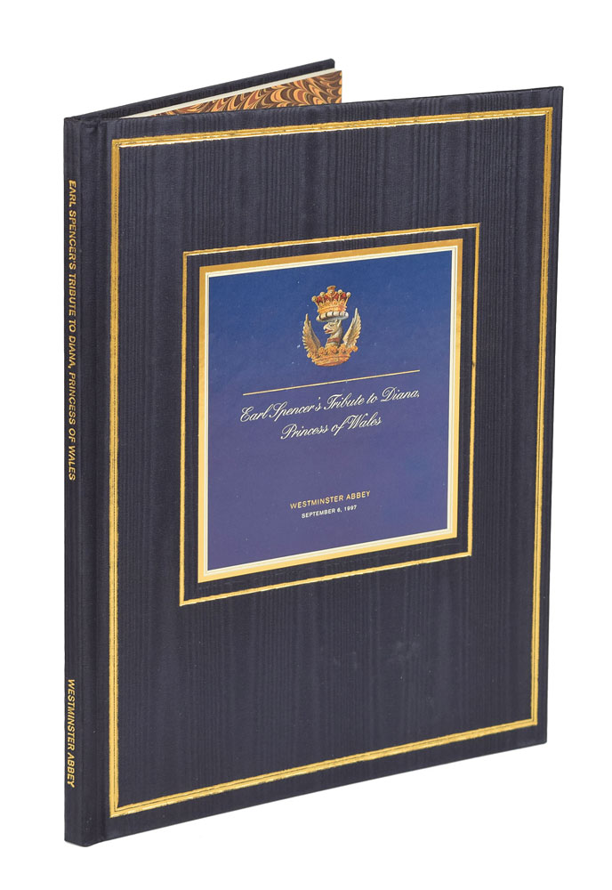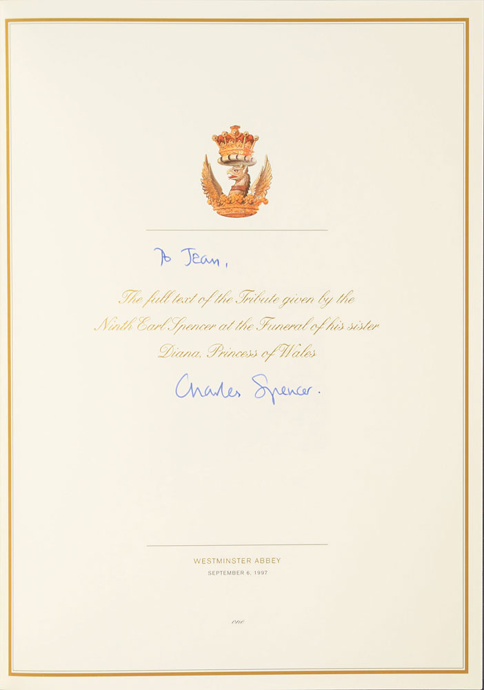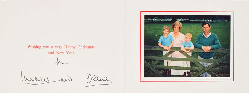 Wonderful 1989 Christmas card embossed on the front with the Prince of Wales’s feathers and Order of the Garter motto and the Spencer family arms, measuring 16 x 6 open, featuring an affixed color photo of the royal couple posing with their two young sons on a wooden fence, signed in fountain pen, "from, Charles and," and in black ink, "Diana." In fine to very fine condition. Accompanied by a silk-bound hardcover copy of Earl Spencer's Tribute to Diana Princess of Wales, published by Althorp in 1997, signed and inscribed on an introductory page in blue ink, "To Jean, Charles Spencer." Includes the original Althorp presentation box.