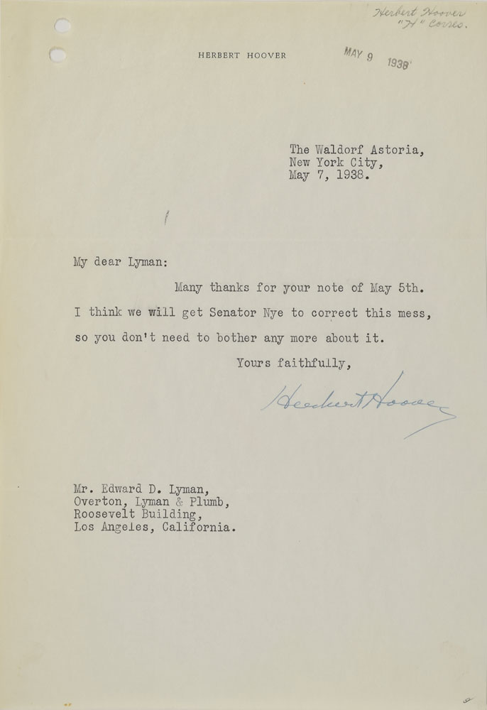 Three post-presidency TLSs from Herbert Hoover, each one page, 7.25 x 10.5, dated between April and May 1938, personal letterhead. Each addressed to Edmund D. Lyman of Overton, Lyman and Plumb, in relation to a libelous article in the Congressional Record associating Hoover with the Pacific Dock and Terminal Corporation. The first letter, dated April 13, 1938, in part: “Please find enclosed herewith a copy of an extract from the Congressional Record. I wish you would look up and see what the People’s Daily World is, and who is Congressman Byron N. Scott. And also examine it as to whether we could go after them for libel of the first order. This story is being circulated all over the country,” with the referenced abstract stapled to the upper left corner; the second letter, dated April 23, 1938, in part: “I have no idea of bringing the matter to a libel suit. But there is such a thing as having it in the Congressional Record, and with the authority of the Record, the thing is going all over the country. The best way to do is to bring pressure on Scott. What I rather had in mind was some reliable and established firm such as yours addressing a letter to Scott, informing him of the complete untruth of his statement, that I had never heard of the company and was never a stockholder, and asking him as a public man to make a public retraction”; and the third, May 7, 1938, in full: “Many thanks for your note of May 5th. I think we will get Senator Nye to correct this mess, so you don’t need to bother any more of it.” Includes additional related correspondence from Lyman and others. In overall very good to fine condition.
