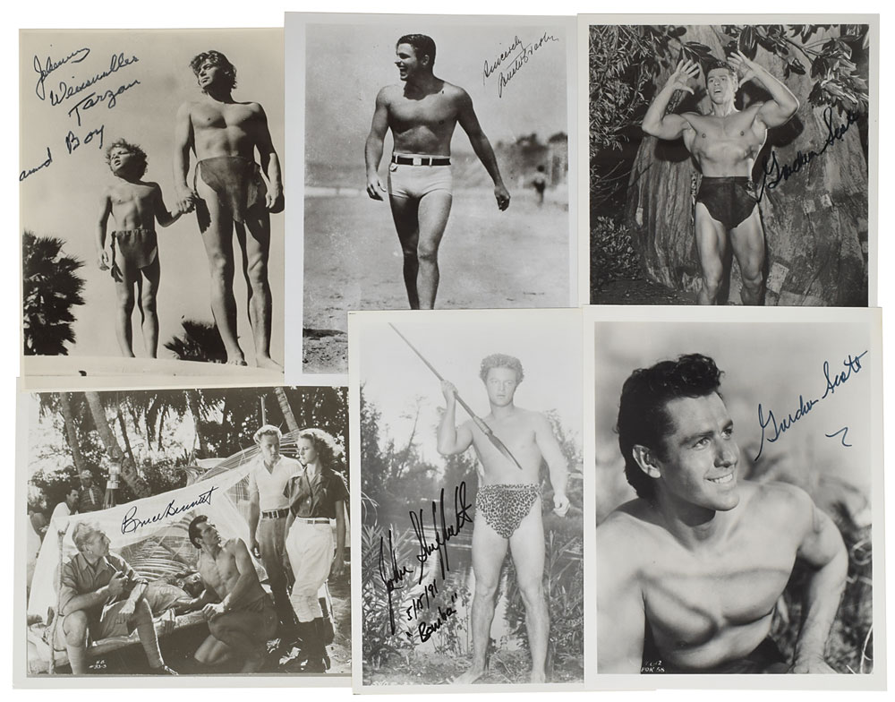 Group of six glossy photos, approximately 8 x 10 or 10 x 8, each signed in black felt tip by an actor from the Tarzan film series, including: Johnny Weissmuller, Buster Crabbe, Gordon Scott (2), Bruce Bennett, and John Sheffield. In overall fine condition, with trimmed edges to the Weissmuller photo.