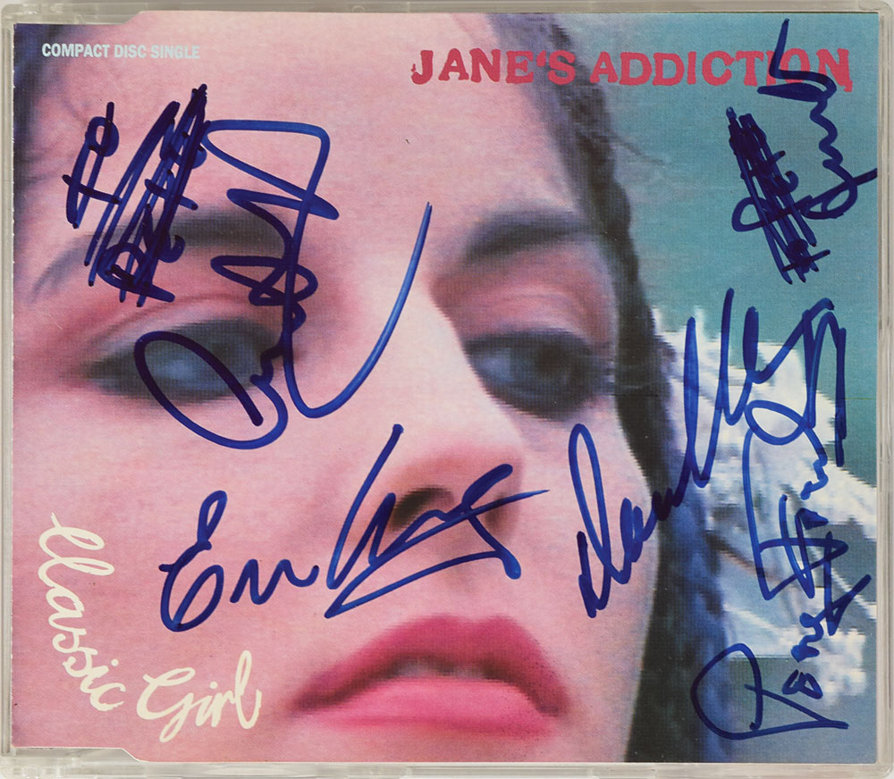 UK import CD for the single Classic Girl, signed on the front cover in blue felt tip by Perry Farrell, Dave Navarro, Eric Avery, and two others, who both cross out inscriptions. In fine condition. The CD is included. From The John Brennan In-person Autograph Collection.
