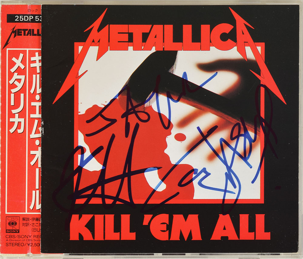 Japanese CD import for Kill'em All, signed on the front of the booklet in blue felt tip by James Hetfield, Lars Ulrich, Kirk Hammett and Jason Newsted. In fine condition. The CD is included. From The John Brennan In-person Autograph Collection.
