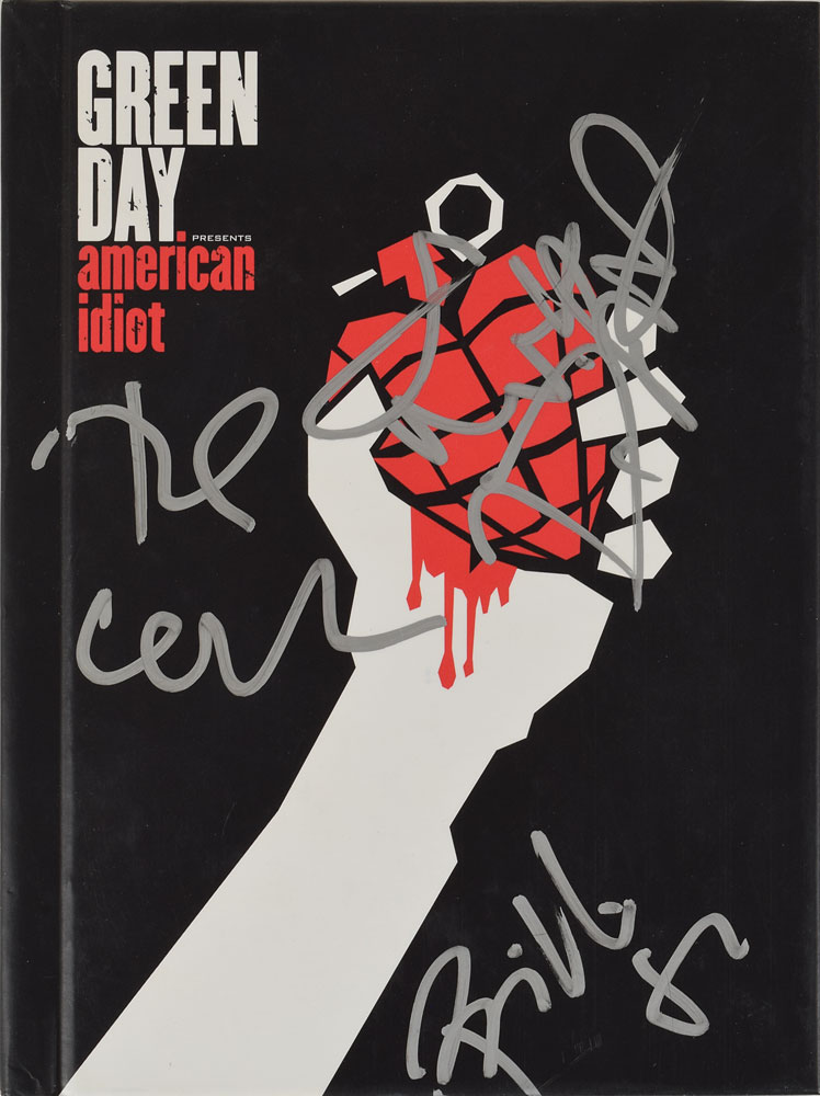 Special edition CD of American Idiot signed on the front cover in silver ink by Billie Joe Armstrong, Mike Dirnt, and Tre Cool. In fine condition. The CD is not included. From The John Brennan In-person Autograph Collection.