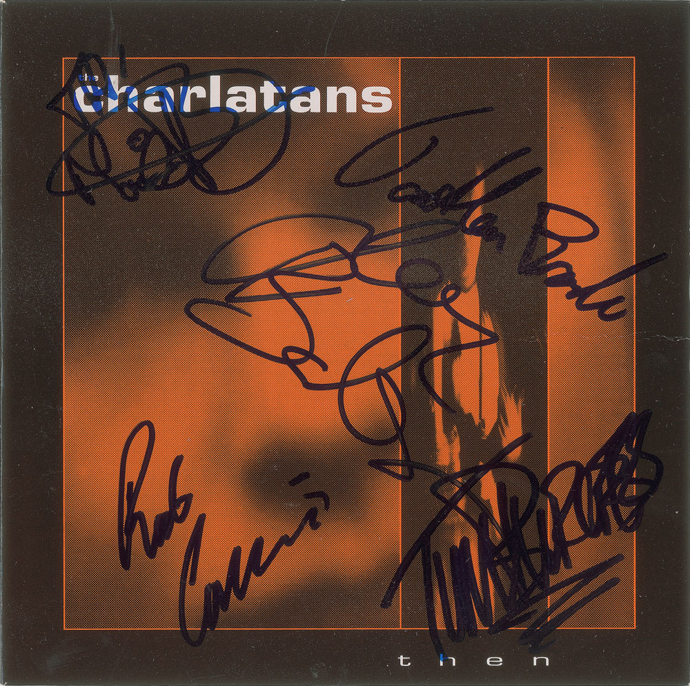 45 RPM single record for 'Then / Taurus Moaner,' signed on the front of the sleeve in blue felt tip by Jon Brookes, Rob Collins, Tim Burgess, Martin Blunt, and Mark Collins. In fine condition. The record is included. From The John Brennan In-person Autograph Collection.