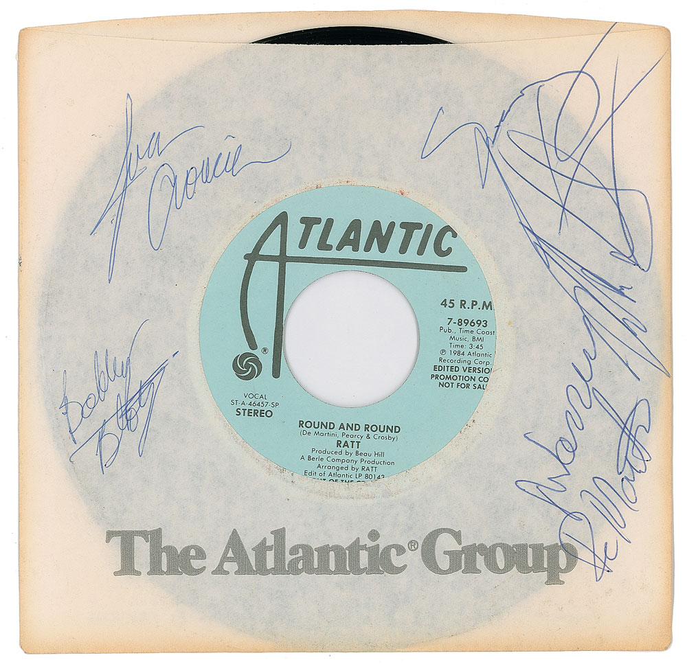 Atlantic Records 45 RPM single record for 'Round and Round,' signed on the white paper sleeve in blue ballpoint by Juan Croucier, Bobby Blotzer, Warren DeMartini, Stephen Pearcy, and Robbin Crosby. In fine condition, with light edge toning. The record is included. From The John Brennan In-person Autograph Collection.