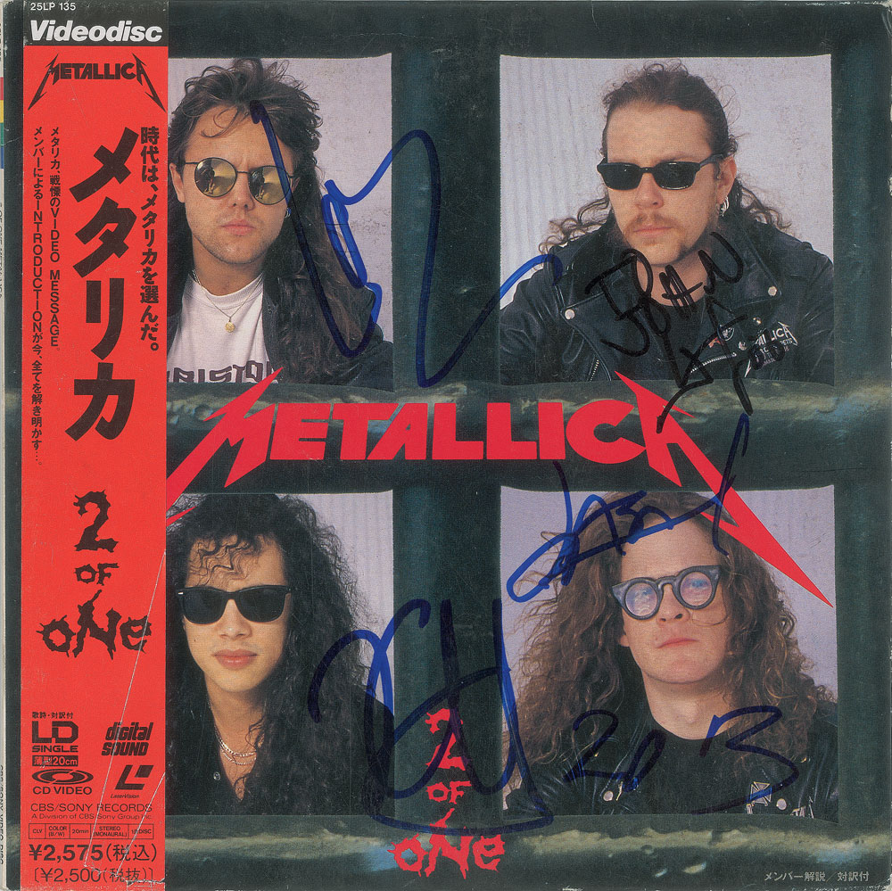 Japanese Videodisc for 'The One Videos,' featuring the "original version" and "jammin' version," signed and inscribed on the front of the sleeve in black felt tip by James Hetfield, and signed in blue felt tip by Lars Ulrich, Kirk Hammett and Jason Newsted, who adds, "2013." In fine condition. The Videodisc is included. From The John Brennan In-person Autograph Collection.