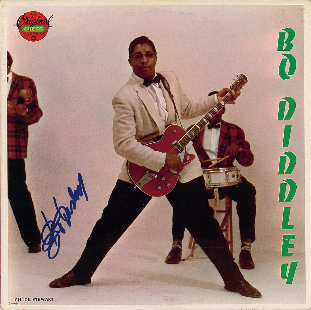 Classic self-titled debut album signed on the front cover in blue felt tip by Bo Diddley. In fine condition. The record is not included. Considered one of the greatest rock 'n' roll debuts of all-time, Bo Diddley served as an essential building-block of the early rock genre—twelve of its tunes exemplify the iconic syncopated 'Bo Diddley beat.' From The John Brennan In-person Autograph Collection.