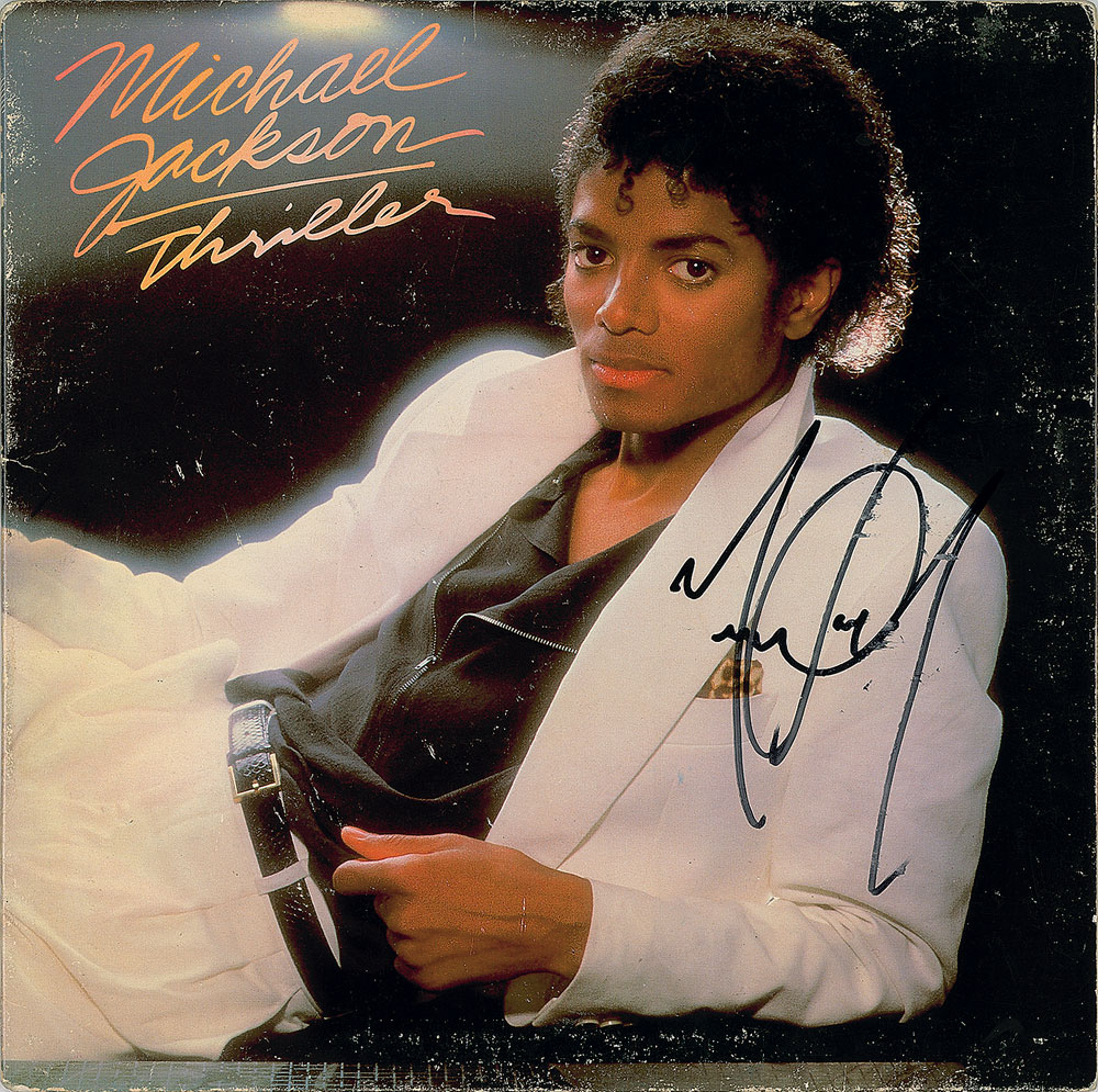Thriller album signed prominently on the front cover in black felt tip by Michael Jackson. In fine condition, with light scuffing, and some brushing to the signature. The record is included. Released in 1982, Thriller is widely considered one of the greatest and most influential pop albums of all time. From The John Brennan In-person Autograph Collection.