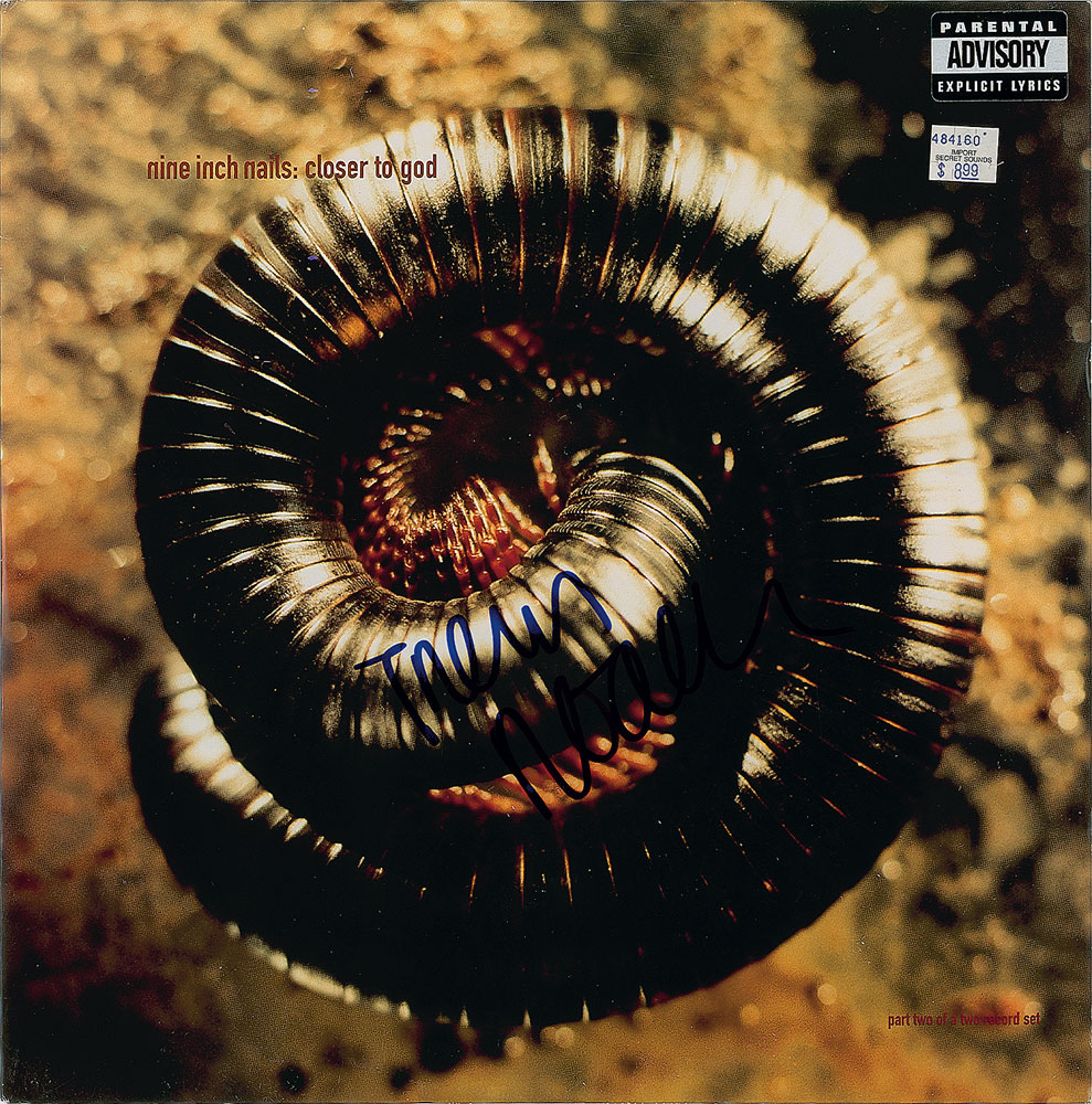 Closer to God album signed on the front cover in blue felt tip by Nine Inch Nails founder Trent Reznor. In fine condition, with a price sticker to the upper right. The record is included. From The John Brennan In-person Autograph Collection.