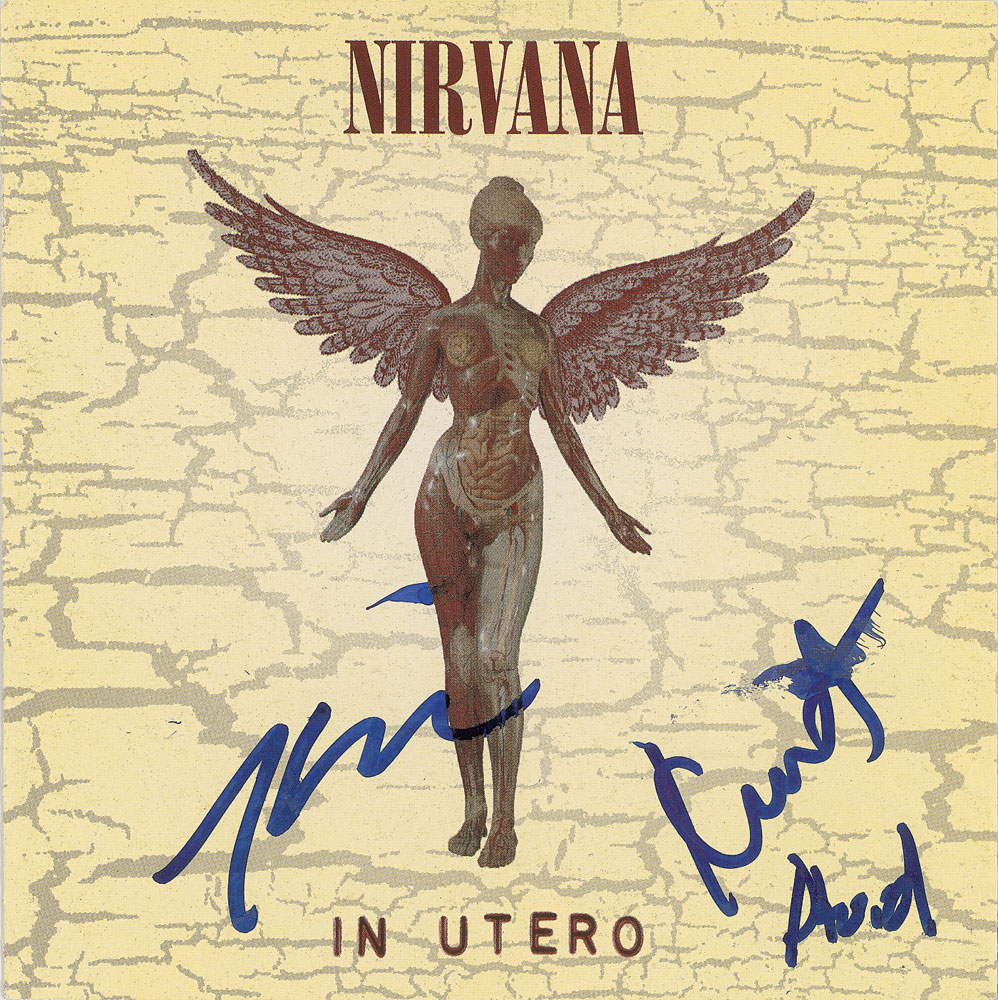In Utero CD booklet signed on the front cover in blue felt tip by legendary singer-guitarist Kurt Cobain, "Kurt"; bassist Krist Novoselic, "Krist"; and drummer Dave Grohl, "David." In fine condition, with brushing to the end of Cobain's signature. Nirvana's third and final studio album, In Utero entered the Billboard 200 chart at number one and received critical acclaim as a drastic departure from Nevermind. A fantastic fully signed Nirvana piece.
