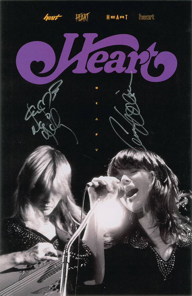 Attractive color 11 x 17 poster of Heart sisters Ann and Nancy Wilson, both signing in silver ink, with the latter adding a small heart with wings. In fine condition. From The John Brennan In-person Autograph Collection.